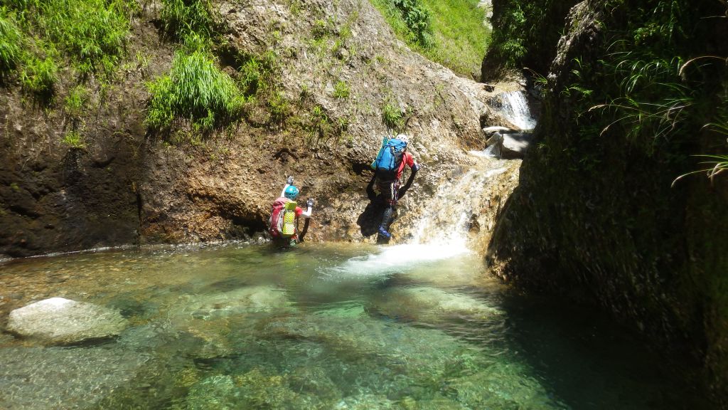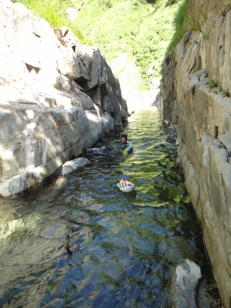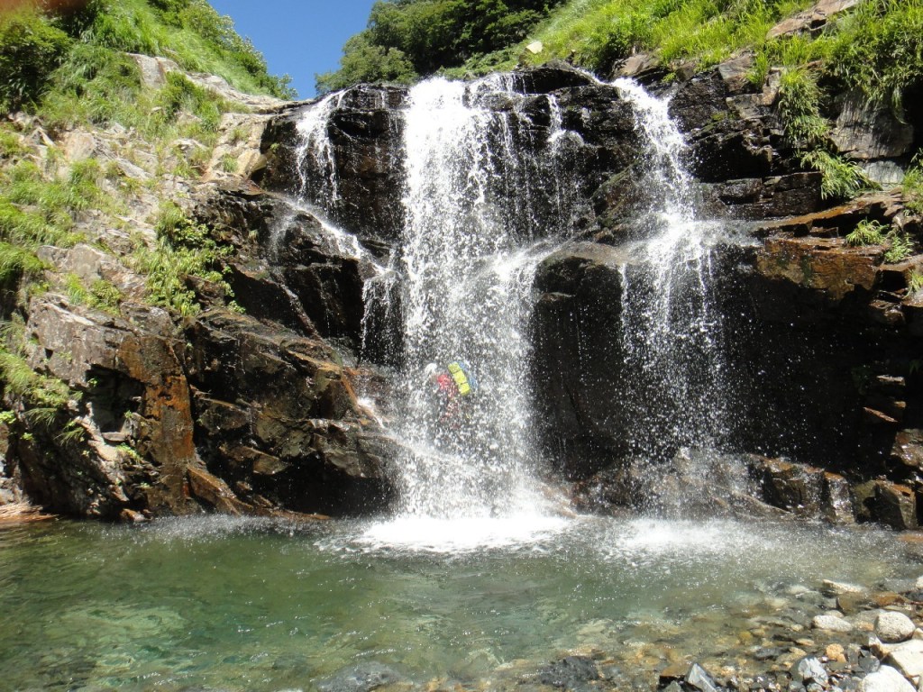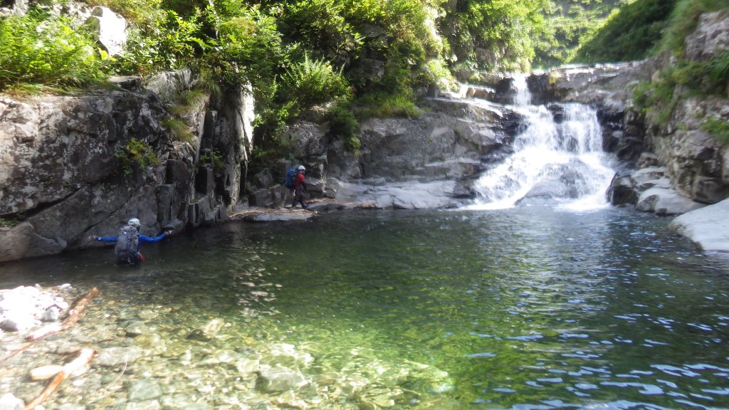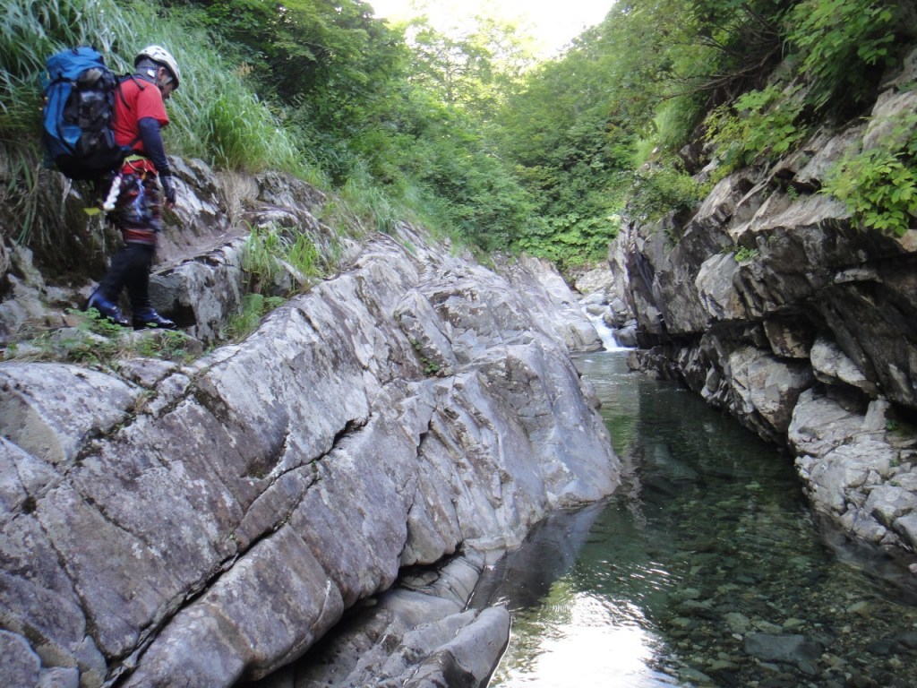 (進藤ま)入渓までのアプローチが2時間ちょっと…しかも沢下降はどんななんだろう?私的に大丈夫かなっとちょっぴりドキドキしながらスタート。まぁアプローチはそれほどの高低差もなく何とか。入渓してかは水量は多くなく冷たくなくて快適でした♪