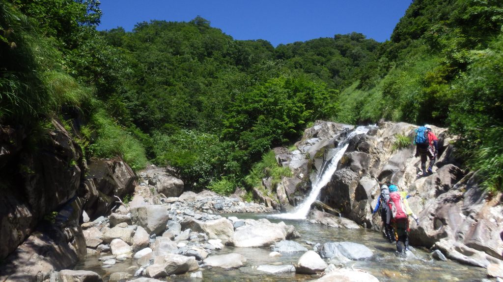★コース:白毛門登山口駐車場→JR見張小屋→武能沢→新道から湯檜曽川本谷の魚止滝の上流へ下りて入渓→白樺沢出合→ウナギの寝床→十字峡→抱返り滝2段20m→3乗10m滝→七ツ小屋沢出合→大滝2段40m→二俣(ビバーク適地)→奥の二俣→ビバーク地(泊)→登山道に合流→朝日岳→笠ヶ岳→白毛門→白毛門登山口駐車場