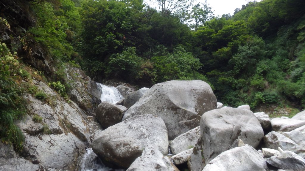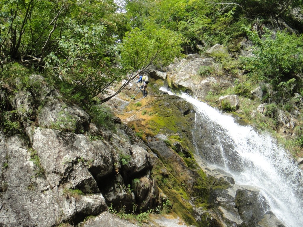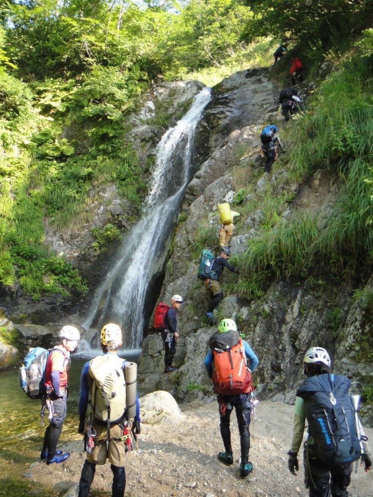 ・20m滝は小さく高巻き。ロープを出して山宮リードで右岸のルンゼから登って滝の左横へトラバースして直上しました。後続はタイブロック等で確保しながら登りました。(12名いたので約1時間30分かかりました。)