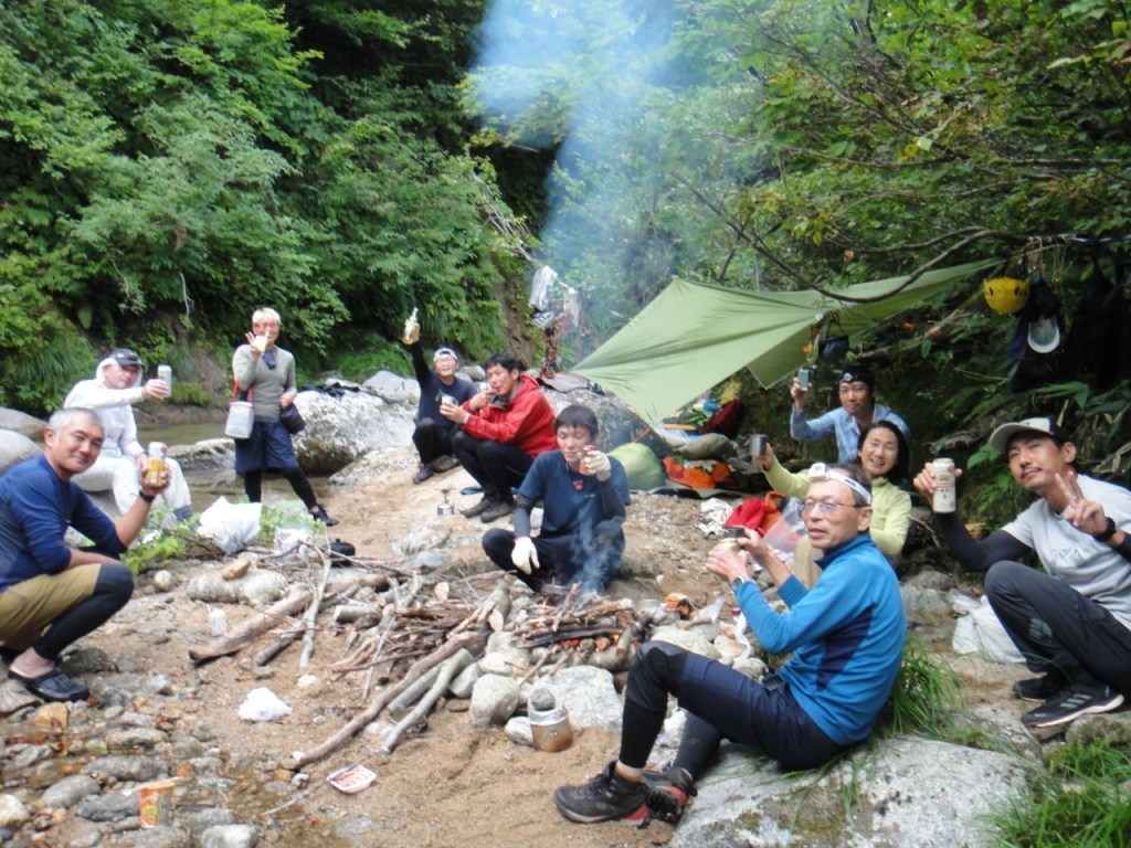 (高橋)満さん リーダーありがとうございました。個人的には3年ぶりの焚火山行楽しむことができました。反省点として、難しい箇所の登攀は先行者のトレースで登れていたが、高巻きやへつりで落ちることがあった。もっと沢を楽しむためにも、ルーファイや登攀のスキルを上げる必要を感じた。皆さん虫の被害は無かったようですが私は寝てる最中に50.60ヶ所ブユに喰われていました…寝る時の虫対策も必要に感じました。