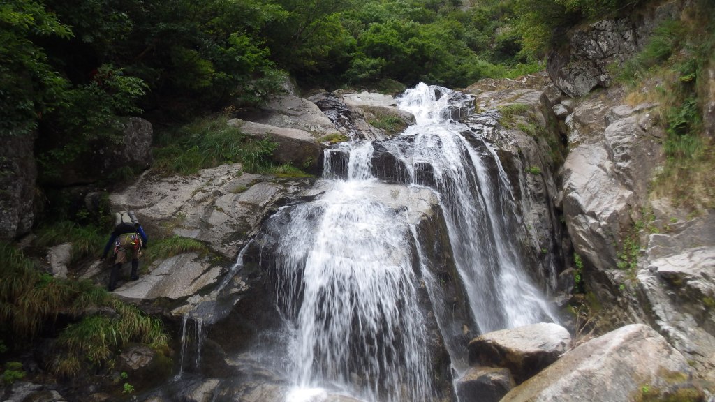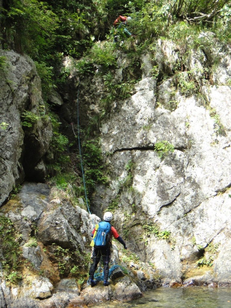 ・17m滝は右壁を登りました。先ず山宮が岩が脆くないかフリーで登れるか確認しながら登りました。途中の1手悪いところの上に残置ハーケンがあったのでハンマーで動かないことを確認してスリングでお助け紐設置。上部も1ヶ所スタンスが微妙だったので滝上灌木を支点にして万が一用のロープを垂らしました。