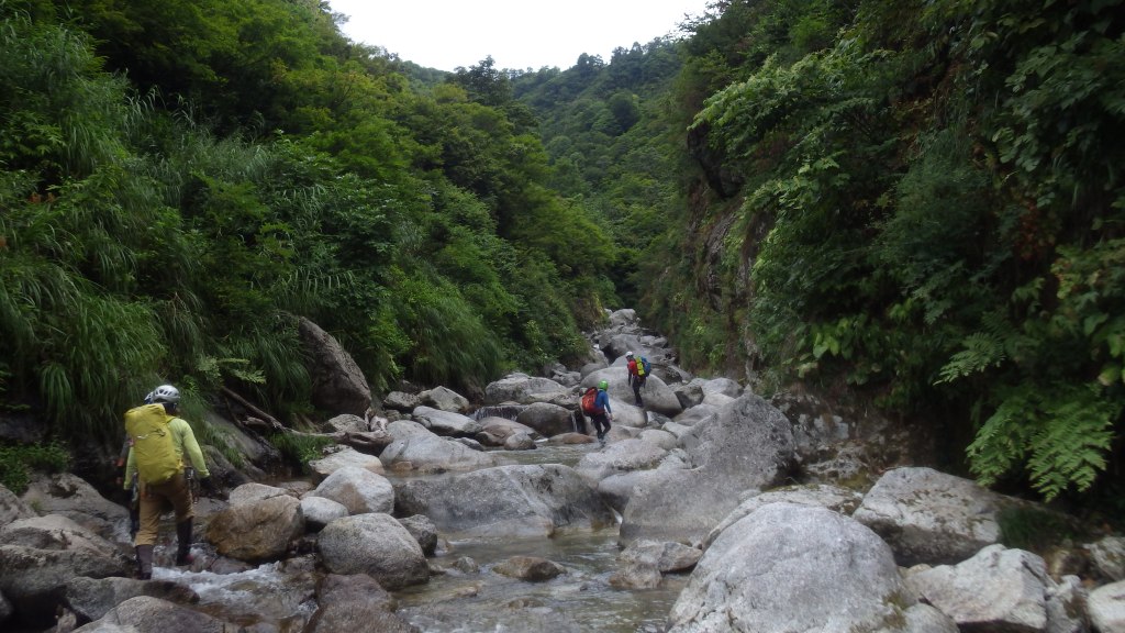 (進藤ま)ヌメリがきついとか高巻きが多いとかのネットの情報をみて靴をフェルトにするかラバーにするか迷いましたが今回はラバーにしてみました。結果やはりヌメリは所々キツイところがあり2回ほど滑って少しだけ落下、1回なんでもない所で滑って転ぶ…その為に両肘を擦り剥き程度ですが流血してました。フェルトにすれば良かったかなぁと思いましたがやはり高巻きや滝を登攀するにはラバーにして良かったと感じました。結局フェルトの人も滑っていましたしね…前回の湯檜曾川本谷の時は4時間超えの下山を沢靴で痛い思いをしたので今回はアプローチシューズを用意。でもその分荷物が増えザックはパンパン!!前回より食料を減らしたつもりでしたが食べずに持ち帰りがあったのでまだまだ持っていき過ぎのようです…次回はもっと減らします。最近沢登りをしていて思った事は遡行図を見てもある程度有名な滝以外では大体の現在位置の把握が難しいので、これからはヤマップの軌跡をダウンロードするだけでなく遡行図に滝やテン場の標高を記載して持って行こうと思いました。今回は総勢12名と大所帯の泊まりでの沢登りでしたが天気にも恵まれ大きな怪我もなく全員無事に下山出来た事は何より良かったです。危なくないように色々な所でサポートしてくれたリーダーの満さん、山宮会長、岸畑さん、そして参加された皆さん大変お疲れさまでした♪