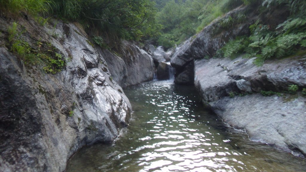 ・七滝の5段100mは手前の3m滝のCS右のつるつるヌメヌメを登ってから左岸を高巻きました。(この3m滝を登らず手前から高巻いた2人はこの高巻きトラバースがルート中一番悪かったと言ってました。)