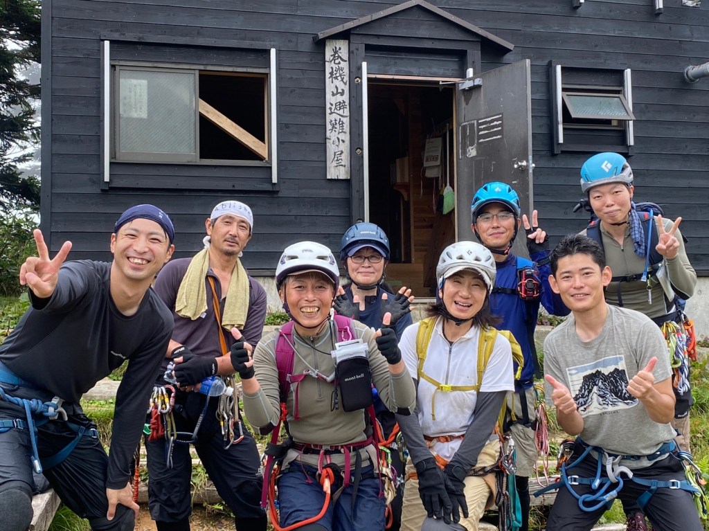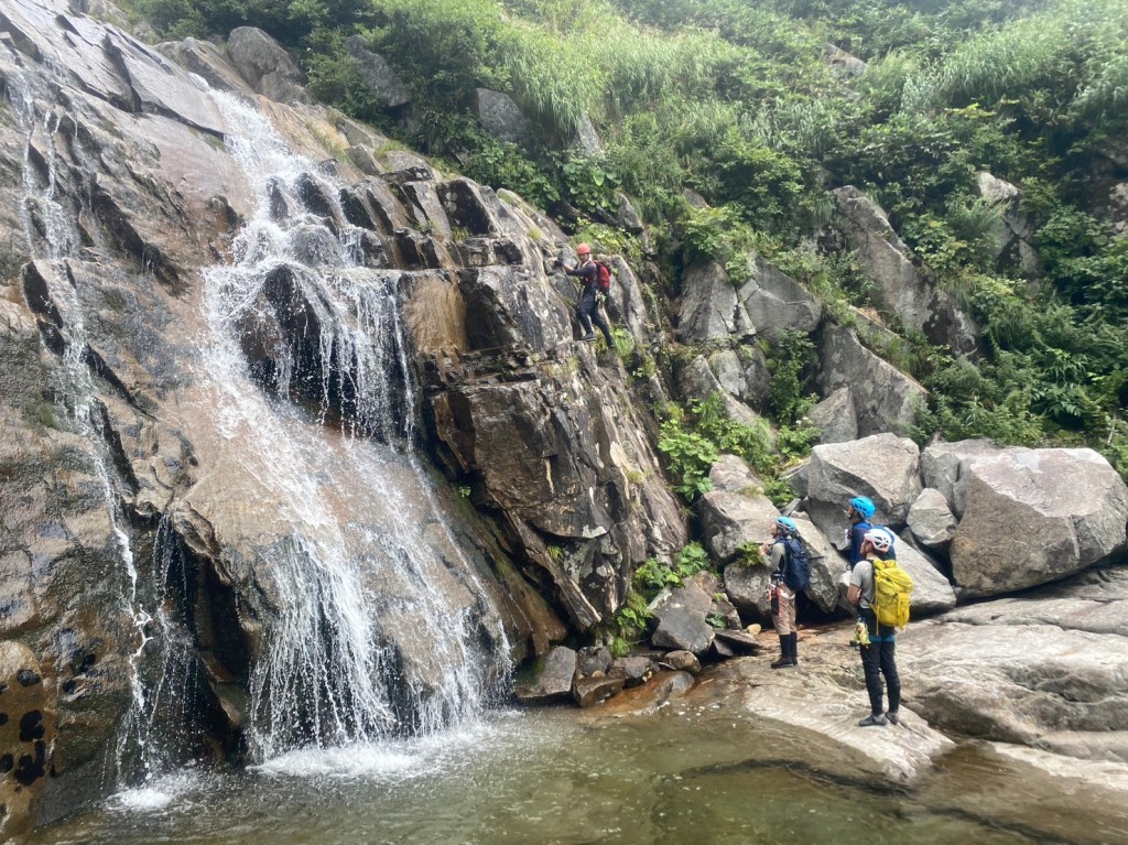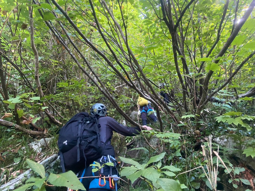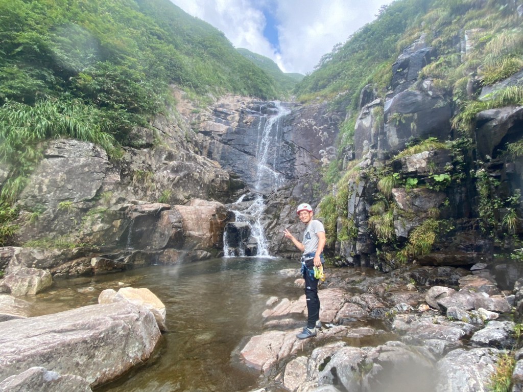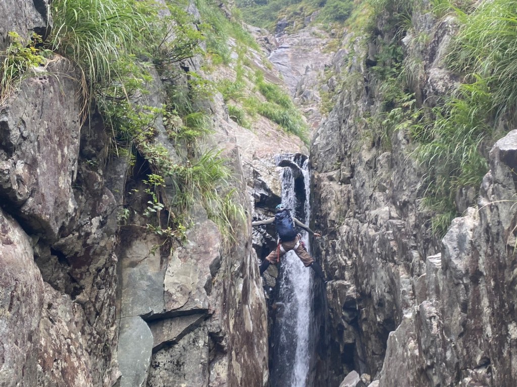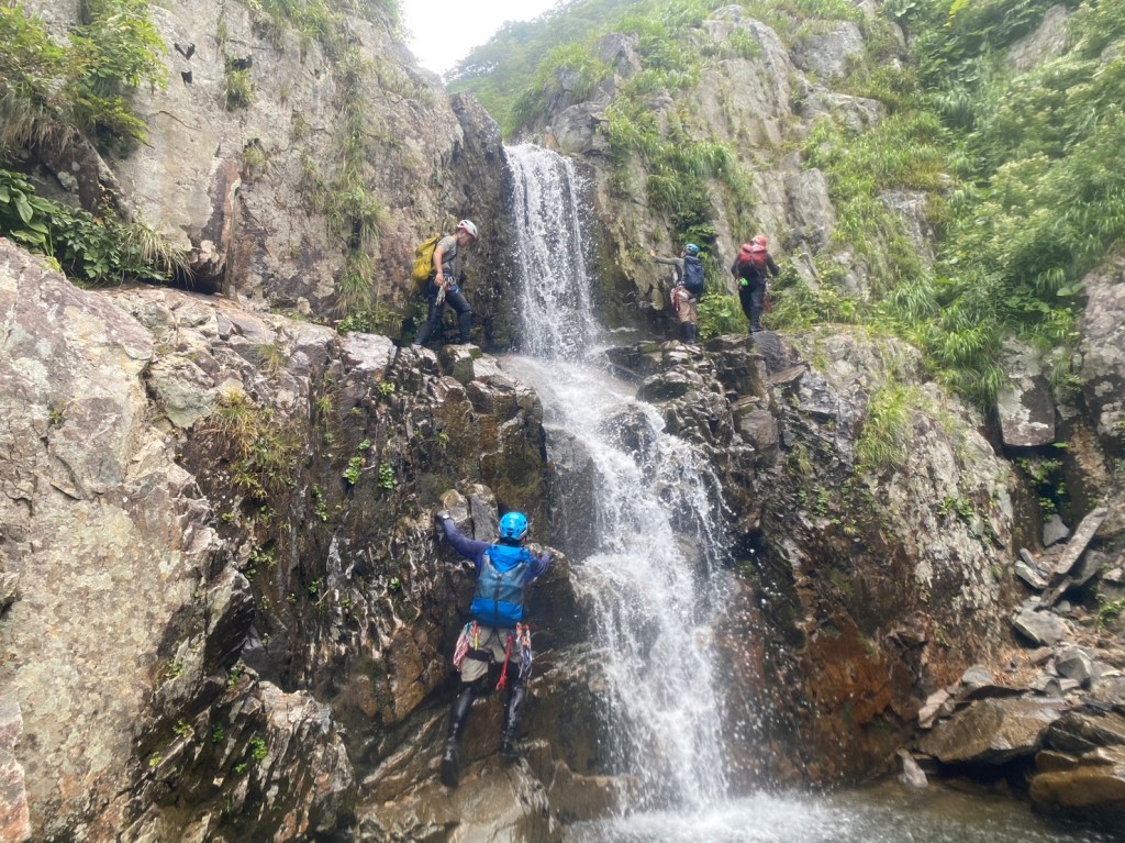 (米山)石附L、先輩方はじめ皆様にご指導いただきながら初の沢登りを経験させていただきました。登攀前のルーファイや滝の中での足場の探し方等、色々と教わり非常に勉強になりました。中盤以降は先輩方に後方でアドバイスもらいつつ、ある時は足を支えてもらいながら登攀させてもらいました。あと登るときは「もし落ちたらどうなる?」を考えることが改めて大切かなと思った次第でした。装備については、事前( 先日のアブミ練習中)にまり子さん、さち子さんに教わったビニール袋の活用等のおかげでザックの中は濡れずに済みました。眼鏡も外れませんでした。お陰で躊躇せず滝に入ることができました。皆さんのおかげで楽しく過ごせました。ありがとうございました。