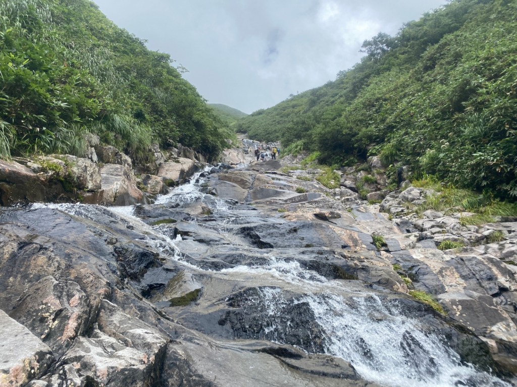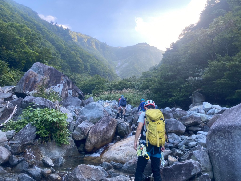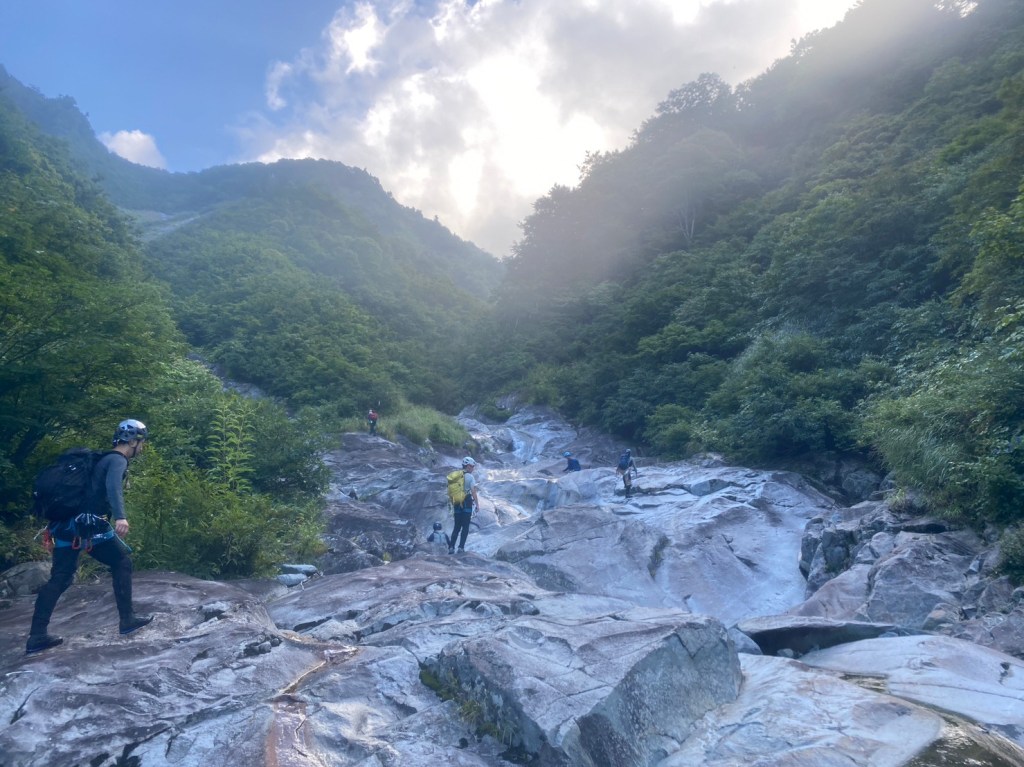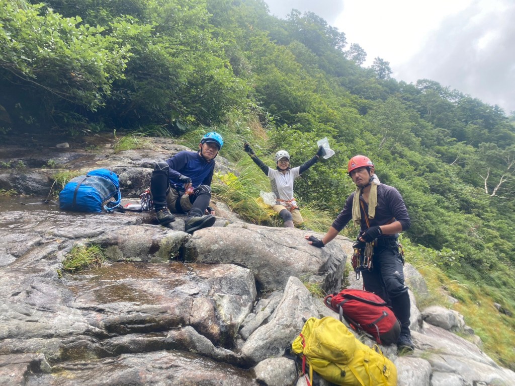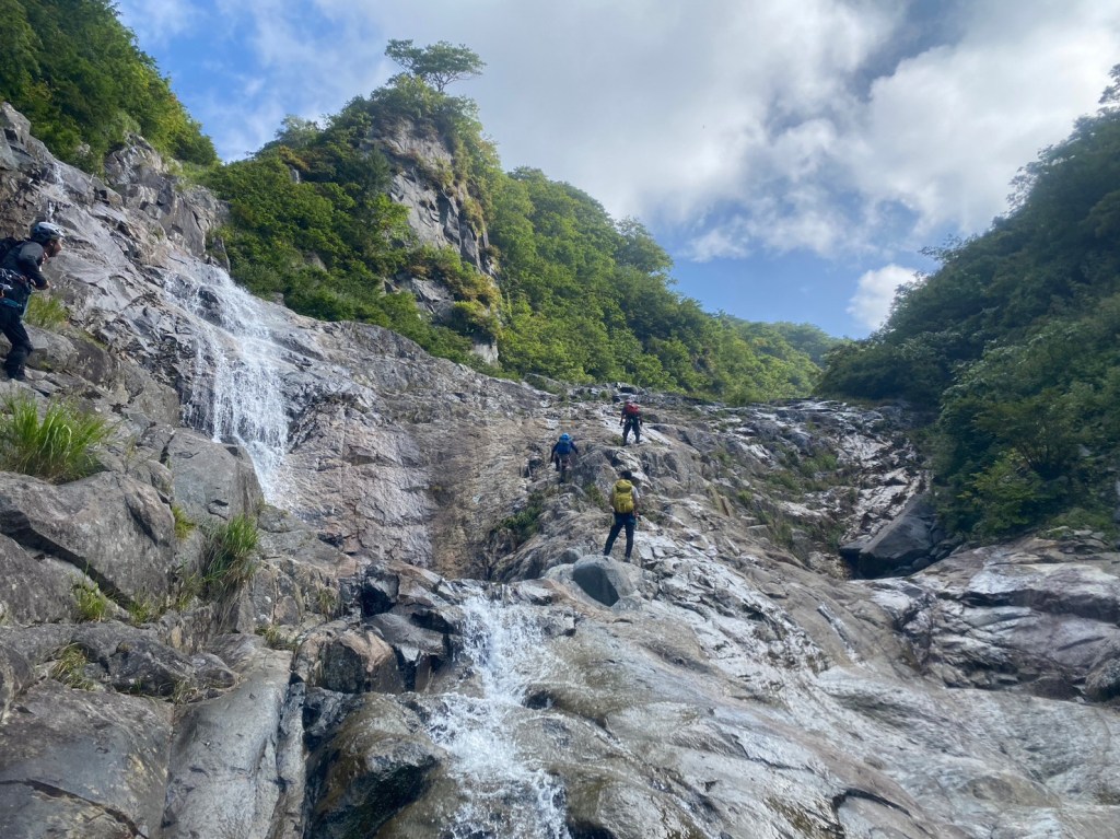 (渡辺さ)初めての米子沢でした。他のパーティの登りを見たり、意見を出しあいながらルートを個々で決めて登りました。ナメ帯の広々とした景色は感動しました!渋滞も無く、スムーズに進めたので予定時間通りに下山できて良かったです。自分の反省点は、ほとんど水に浸からなかったので次回は滝にできるだけトライしたいと思います!