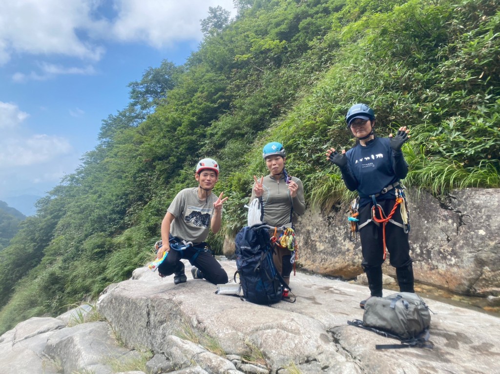 (廣澤)初めて会山行に参加させていただきました。石附さんはじめ先輩方に沢山サポートをしていただきながら、なんとか怪我なく下山することができました。途中、滝の中にはまって動けなくなりロープを出していただいたり、高さに腰がひけて動けなくなったりした際にも、皆様に優しく声をかけていただきました。沢登りは2回目でしたが、やはり高いところでは恐怖心が強くなります。もっとクライミングや歩行の技術、ロープワークを身に付け、自信をもって登ることができるようになりたいです。反省点は沢山ありますが、とても楽しかったです。最高の一日でした!ありがとうございました!