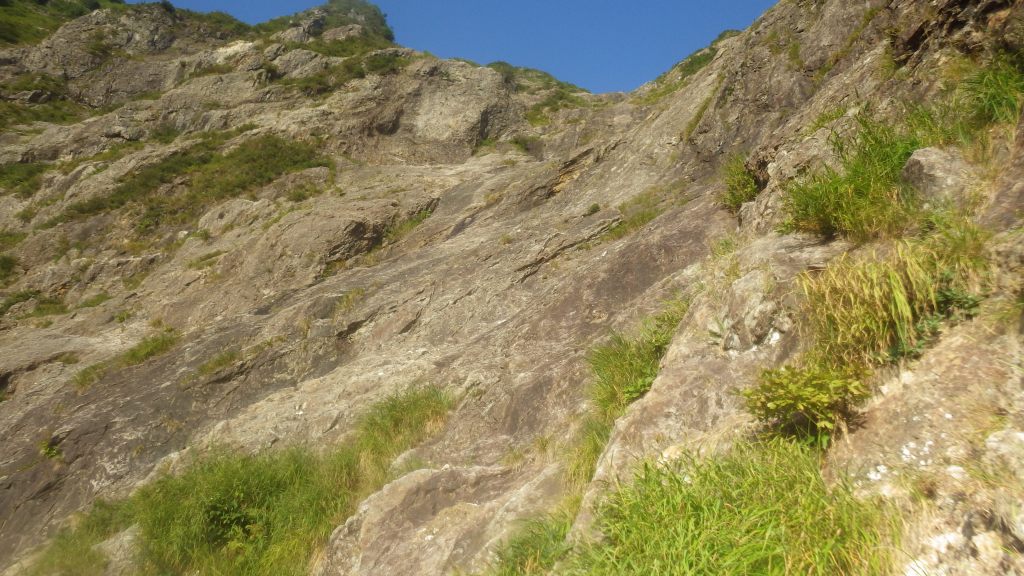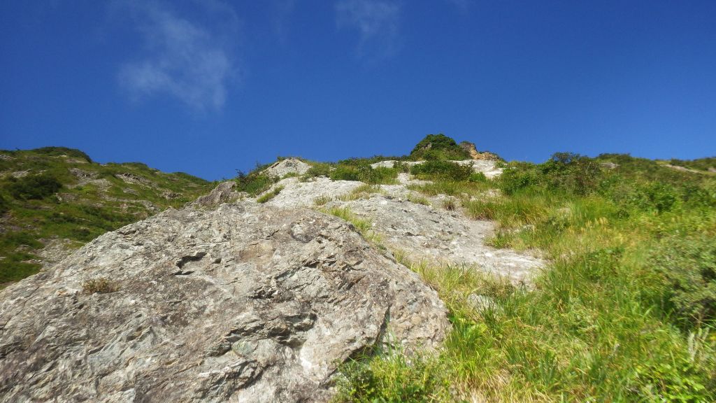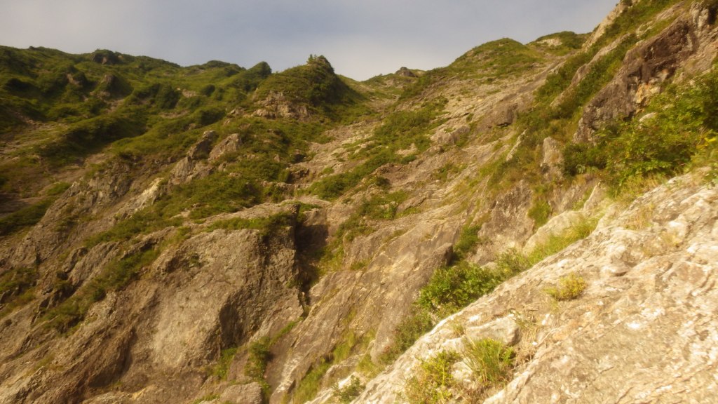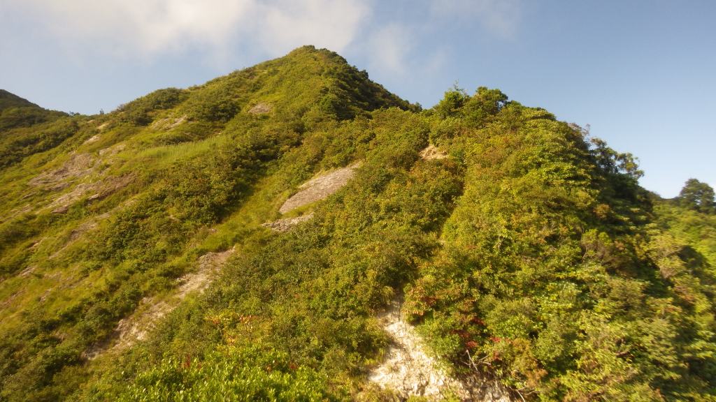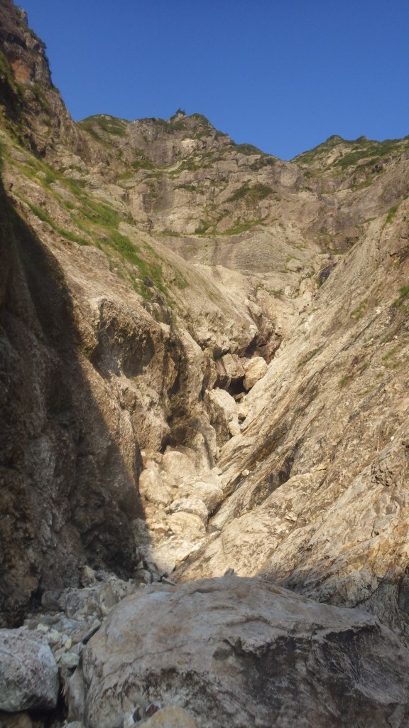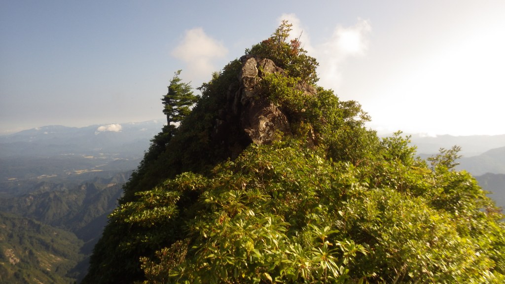 ・現地では本谷ルンゼがどのルンゼなのか分かりませんでした。(そもそも詳しく調べていってないので分からなくて当然ですねw『簡単な右へ右へと登っていくと本谷ルンゼから逸れていきトラバースで戻るのが微妙に悪い。』ぐらいの情報しか頭に入ってませんでした。)テン場から見上げた時に稜線上の右に小さい峰(左)と大きい峰(右)が見えていて大きい峰を雨乞峰と勘違いしてました。(この峰は雨乞峰からだいぶ右にある稜線上のただの峰でした。)本谷ルンゼは御神楽岳近くの稜線に続くスラブだと勝手に勘違いしていたので当然雨乞峰の左側にあるルンゼだろうと思ってました。小さい峰より左の稜線に出るルンゼと右の稜線に出るルンゼ・・・左のルンゼが本谷ルンゼだろうと思い込みそこを目指して登りました。登っていくと小さい峰へと続くリッジ状の末端に到達、そこから見た左のルンゼへのトラバースは微妙に悪そうに見えたのでここでどうするか協議しました。左へトラバースするか、小さい峰へと続く正面のリッジ状を登るか、右へトラバースするか・・・特に本谷ルンゼにこだわりは無いし悪いトラバースより安全で簡単そうな正面のリッジ状を登って稜線へ出ることにしました。稜線に出てテン場からは見えてなかった峰が雨乞峰だと分かりテン場から見えてた大きい峰が雨乞峰ではないことにそこで気付きました。そして雨乞峰より右の稜線へ出たので『どれが本谷ルンゼかなー?』と雨乞峰より左のルンゼを見てましたが、下山後に日本登山大系で確認したら本谷ルンゼは雨乞峰より右の稜線に出るルンゼで私たちが今回登ったリッジ状の左のルンゼが本谷ルンゼでした。(雨乞峰の峰を間違っていたことや稜線へは雨乞峰より左に出るのが正解だと思っていたことでテン場から見た本谷ルンゼと思ってところが結果的に本谷ルンゼでしたw)ネット記録のログも下山後に確認しましたが皆さん雨乞峰より右の稜線に出てました。そして私たちと同じくリッジ状を登る人もいたしリッジ状の右のルンゼを登る人もいたました。もちろんリッジ状の左の本谷ルンゼを登る人もいました。スラブはどこでも登れる感じなので初見ではルーファイは難しいと思います。
