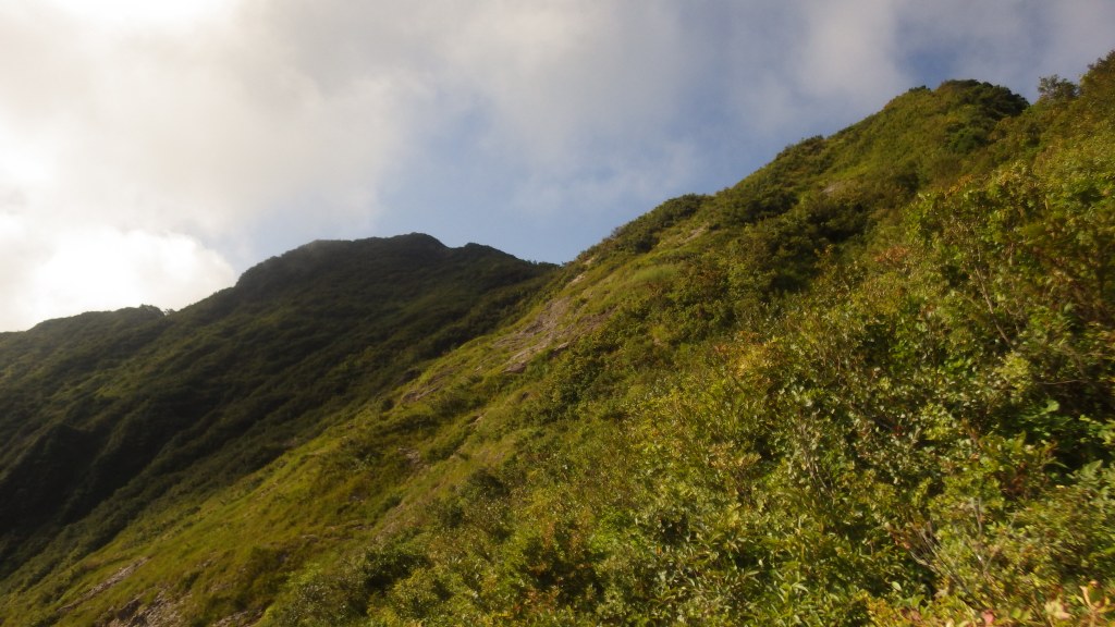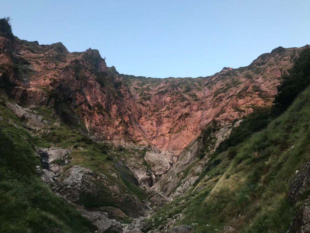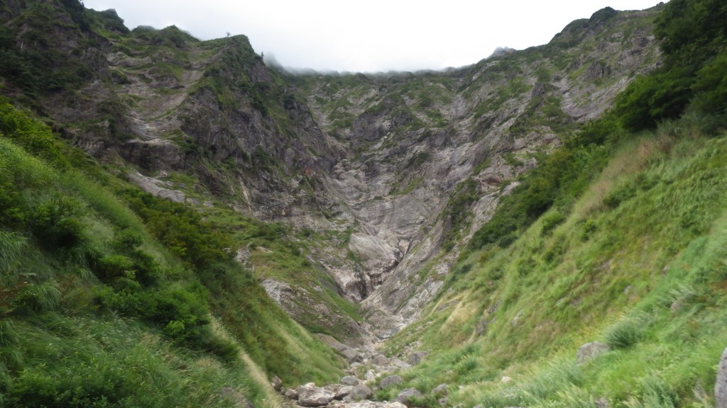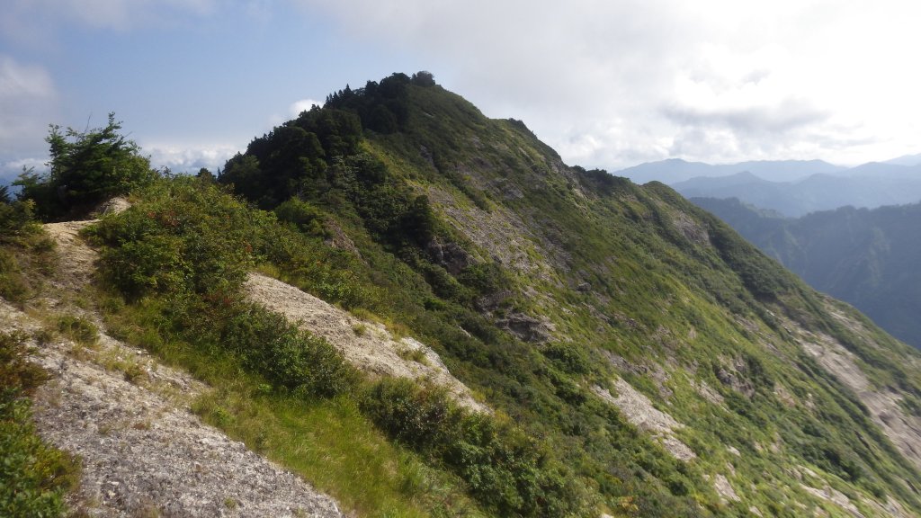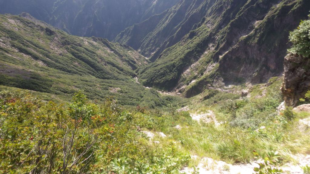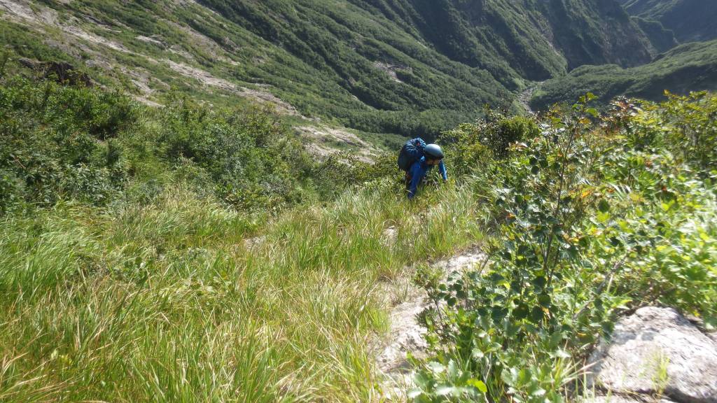 ・現地では本谷ルンゼがどのルンゼなのか分かりませんでした。(そもそも詳しく調べていってないので分からなくて当然ですねw『簡単な右へ右へと登っていくと本谷ルンゼから逸れていきトラバースで戻るのが微妙に悪い。』ぐらいの情報しか頭に入ってませんでした。)テン場から見上げた時に稜線上の右に小さい峰(左)と大きい峰(右)が見えていて大きい峰を雨乞峰と勘違いしてました。(この峰は雨乞峰からだいぶ右にある稜線上のただの峰でした。)本谷ルンゼは御神楽岳近くの稜線に続くスラブだと勝手に勘違いしていたので当然雨乞峰の左側にあるルンゼだろうと思ってました。小さい峰より左の稜線に出るルンゼと右の稜線に出るルンゼ・・・左のルンゼが本谷ルンゼだろうと思い込みそこを目指して登りました。登っていくと小さい峰へと続くリッジ状の末端に到達、そこから見た左のルンゼへのトラバースは微妙に悪そうに見えたのでここでどうするか協議しました。左へトラバースするか、小さい峰へと続く正面のリッジ状を登るか、右へトラバースするか・・・特に本谷ルンゼにこだわりは無いし悪いトラバースより安全で簡単そうな正面のリッジ状を登って稜線へ出ることにしました。稜線に出てテン場からは見えてなかった峰が雨乞峰だと分かりテン場から見えてた大きい峰が雨乞峰ではないことにそこで気付きました。そして雨乞峰より右の稜線へ出たので『どれが本谷ルンゼかなー?』と雨乞峰より左のルンゼを見てましたが、下山後に日本登山大系で確認したら本谷ルンゼは雨乞峰より右の稜線に出るルンゼで私たちが今回登ったリッジ状の左のルンゼが本谷ルンゼでした。(雨乞峰の峰を間違っていたことや稜線へは雨乞峰より左に出るのが正解だと思っていたことでテン場から見た本谷ルンゼと思ってところが結果的に本谷ルンゼでしたw)ネット記録のログも下山後に確認しましたが皆さん雨乞峰より右の稜線に出てました。そして私たちと同じくリッジ状を登る人もいたしリッジ状の右のルンゼを登る人もいたました。もちろんリッジ状の左の本谷ルンゼを登る人もいました。スラブはどこでも登れる感じなので初見ではルーファイは難しいと思います。