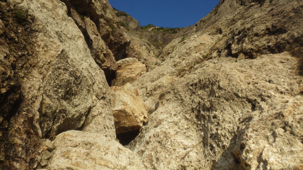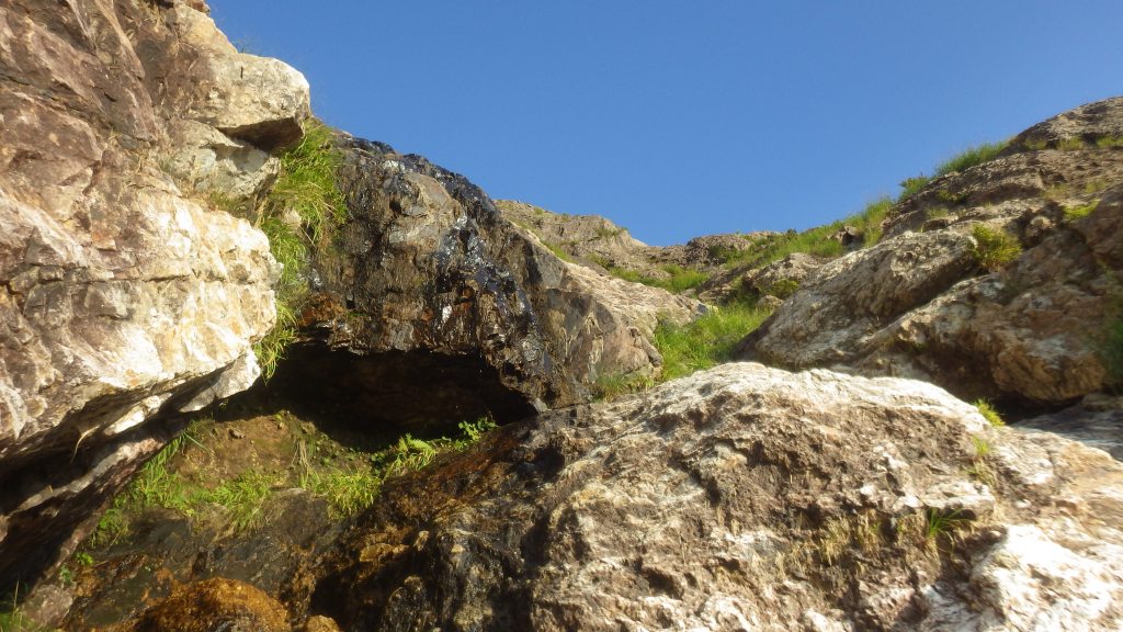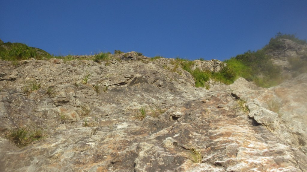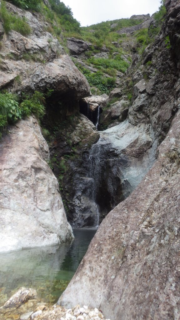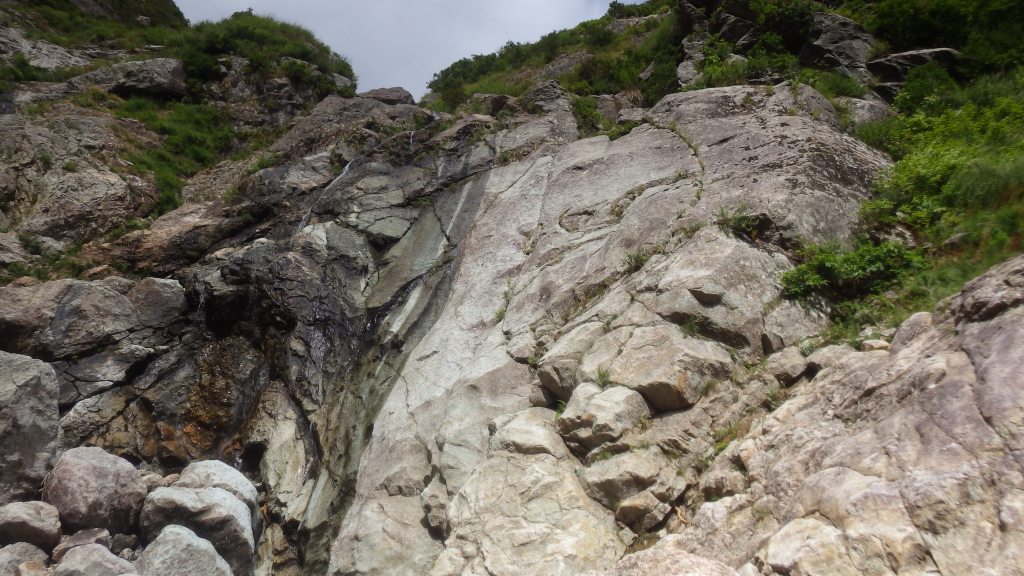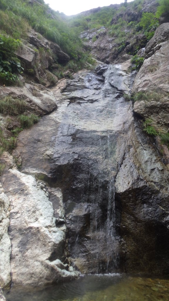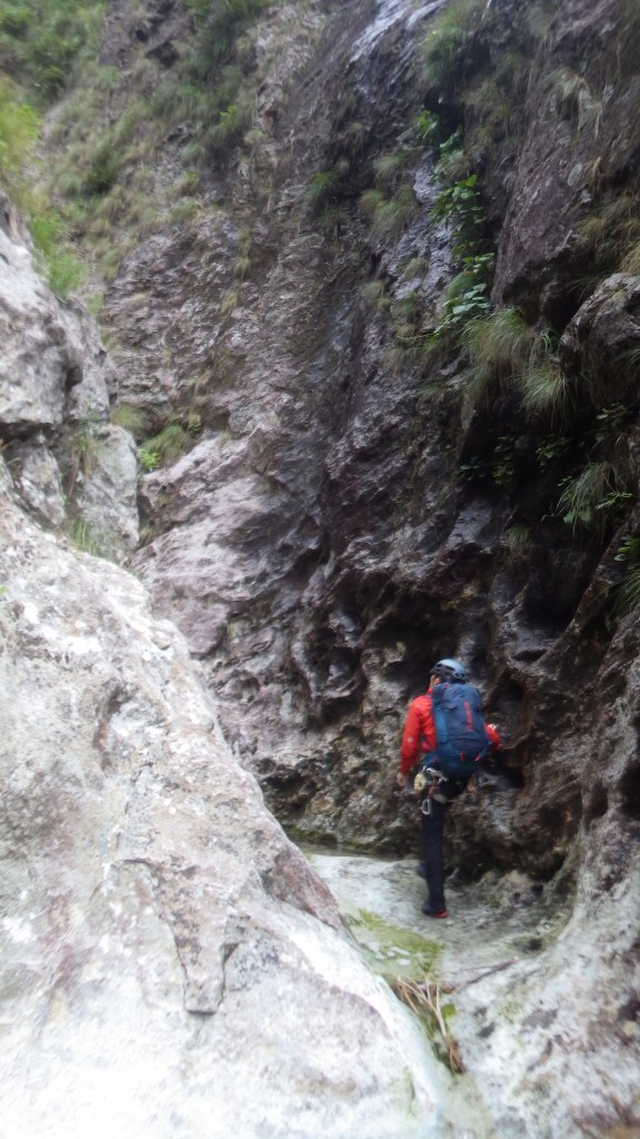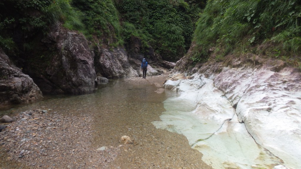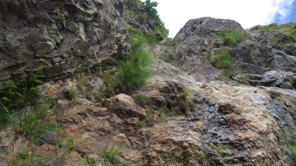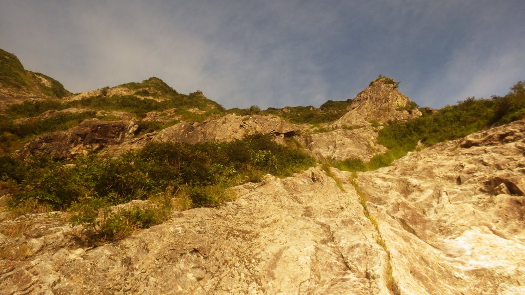 ・上部ゴルジュ2段10m滝(6m+CS4m)はロープを出して2段繋げて登りました。(山宮リード)下部6m滝は泳いで左壁に取付き少し登ってから右上ラインで登りました。ガバやカチのホールドは豊富。スタンスの細かいホールドはヌメリ有り。体勢が悪い状態で右足はヌメった細かいスタンスに乗せた状態で次の手を出したら右足が滑って釜まで落ちました・・・。(左壁下部にカム2つで支点取ってました。上のカムはヌメヌメしたクラックにセットしたのでフォールしたら抜けると思ってましたがテンション掛からずに釜まで落ちました。要因は上部の右上部分ではクラックやリスが見つけられずランナウト気味、ビレイ地点は釜手前なのでロープも伸び伸びだったことが挙げられます。)気を取り直して登ったときにスタンスを確実に決め初見で見えてなかったホールドも使って登ったら驚くほど普通に登れました・・・。沢での初見リードの経験不足なんですかねー。(反省。)上部CS4m滝は手前の左壁から登りました。ここでフォールして下の釜まで落ちるのも嫌なのでアングルハーケンを1つ決めて登りました。乗越した先が下から見えないのでリードでは思いきりが付きませんでしたが登ってみるとホールドがあり問題なく登れました。