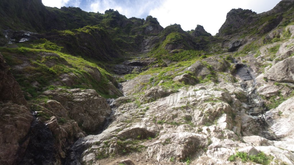 ・上部ゴルジュ10m滝はロープを出して左から灌木に届くところまで草付を登ってその灌木に支点を取り、左手で灌木を握って右に身体を移動させてから右上ラインで登りました。(山宮リード)特に難しいことはなく問題なく登れました。(多くの記録では御神楽滝以外での核心はこの滝らしいですが・・・。)