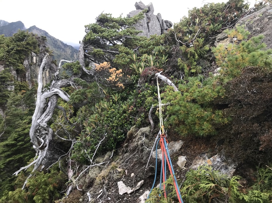 ・終了点は灌木にスリングで構築。(中央稜少し手前の灌木帯)