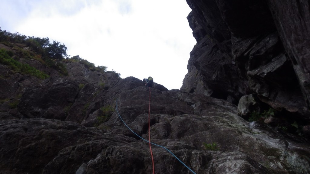 ・トポ2P目は適当に登れそうなラインを登りました。傾斜がなくなると正面に3P目のスラブが見えます。この滝左スラブは正面から右が濡れていたので乾いていた左から登りました。