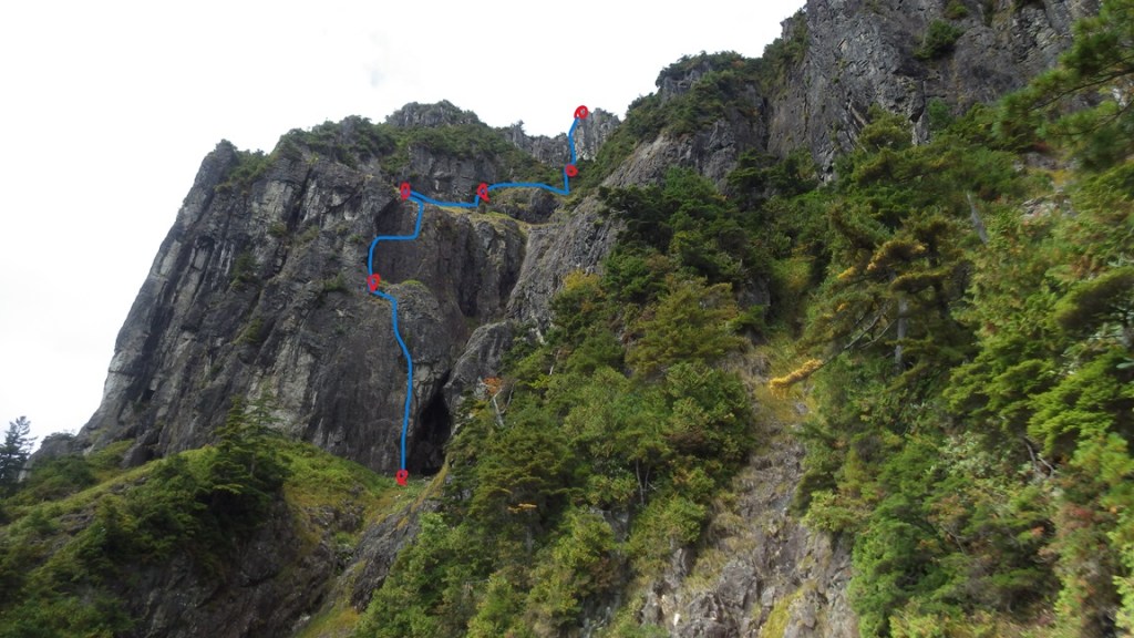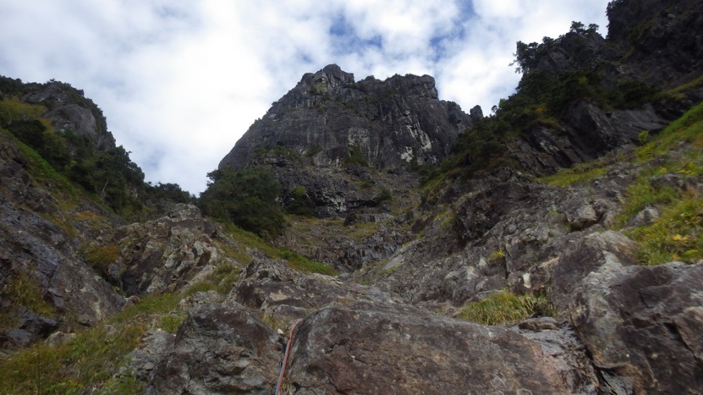 ・右奥に見えている岩峰中央下を目指して滝の階段状からスラブを登りました。スラブを右へ登っていくと岩峰中央下は階段状になりますが終了点構築のために少し左の灌木帯へ戻りました。