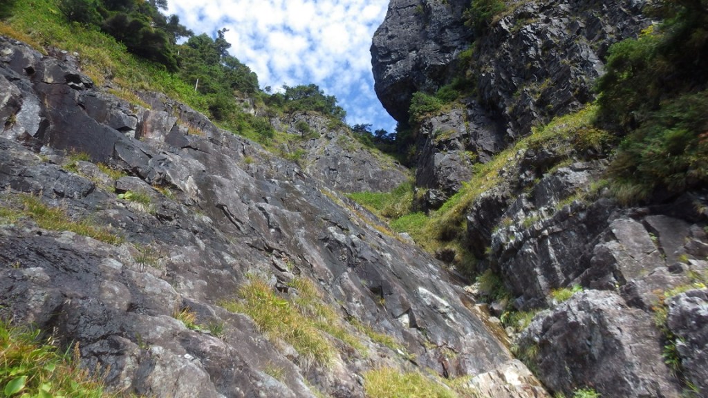 ・滝左のスラブを右上していくと草付、ガレ、階段状となります。