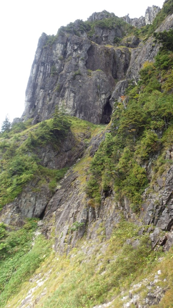 ・中央稜を越えると錫杖岳下部の大洞穴が見えました。大洞穴下の洞穴までは草付を歩いて、大洞穴下の洞穴から大洞穴まではルンゼ右の階段状を登りました。