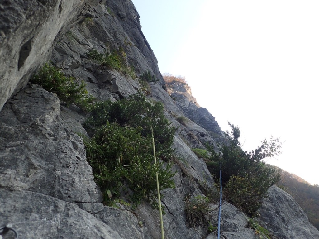 ・14P目の凹状の垂壁以外は残置中間支点は少ないです。(カムや灌木等を多用して対応できます。)