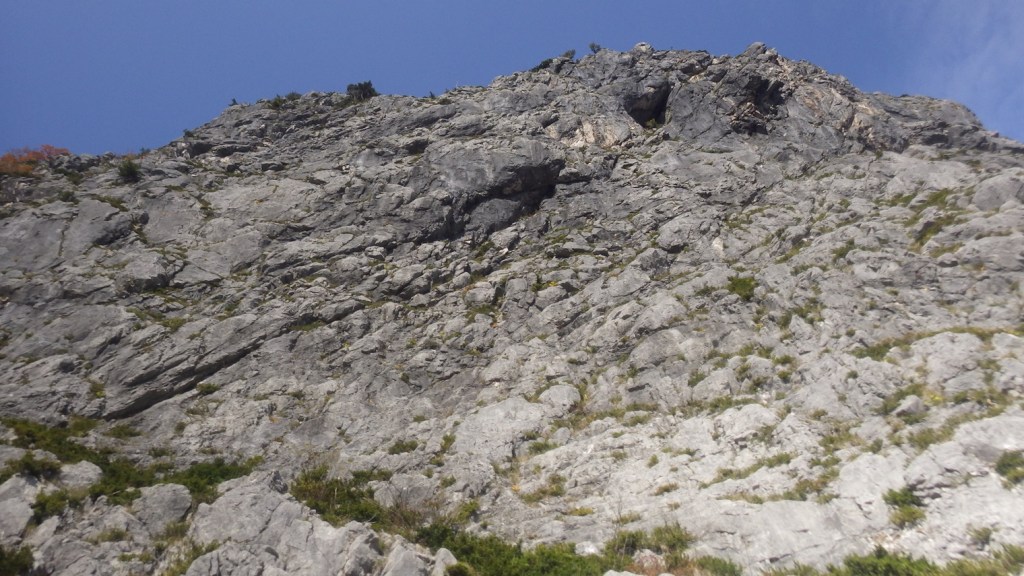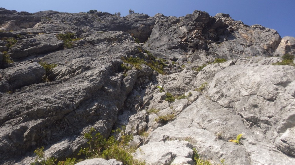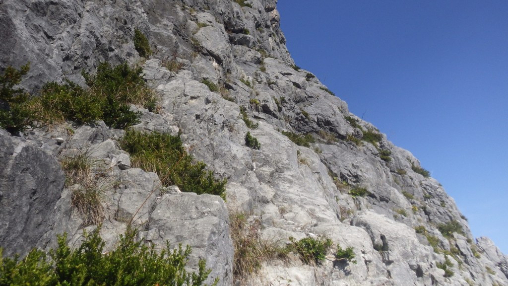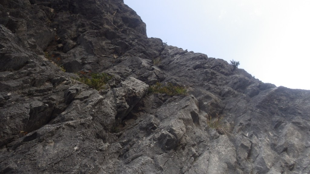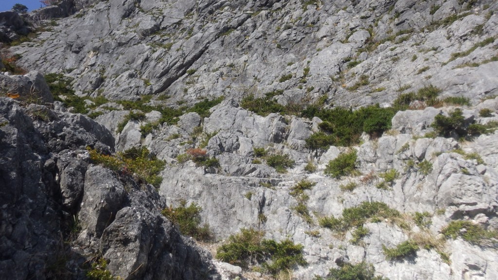 ・中央バンドのガレ場の左の岩をしばらく登って適当なところでガレバ場を横断して適当なところから一段上のテラスへ登ります。