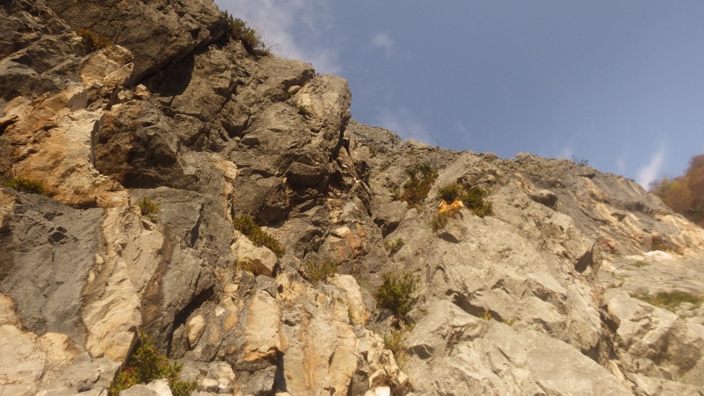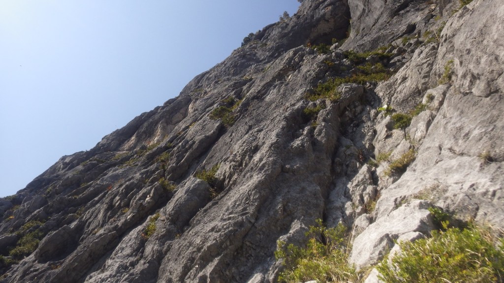 ・凹角を抜けると景色が開けます。右に見えるスラブにはたくさん残置中間支点が見えますがそちらへは迷い込まず残置中間支点の無い階段状フェイスを上へ登るとハング帯下に終了点が見えてきます。