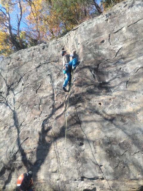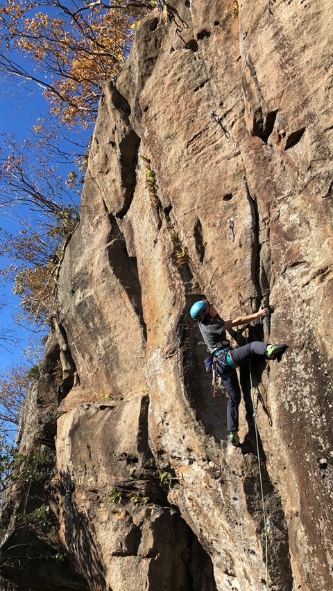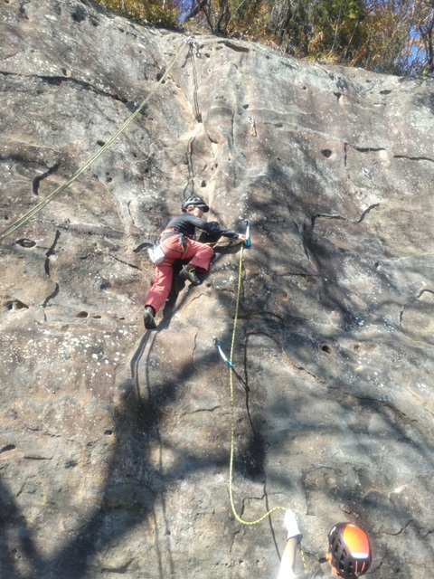 (坂井)晴れて紅葉もキレイでよかったです。風が吹くと寒かったです。今回はエンクラでゆるゆる登りで楽しみました。皆さんの登りが見られたのも楽しかったです。バラ色のエアメール1便敗退でしたが、ホールドははっきりした課題で面白かったです。でもマントルは常に恐怖です…。