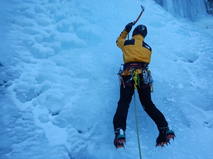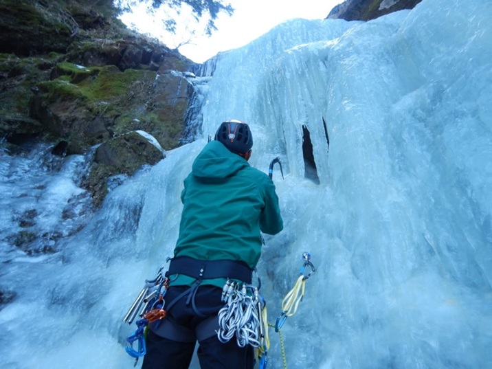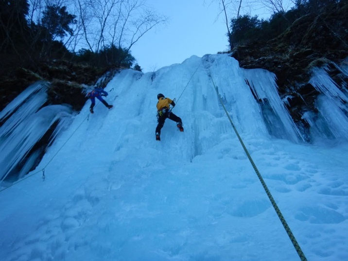 (土田忍)木村さんのお誘いにより、初アイスに夏沢鉱泉アイスギャラリーに行って来ました。当日、夏沢鉱泉のスタッフの方の情報によると、G4、G3は凍っているとのことで、初日は1番大きなG4へ行くことに。20m程の高さの氷瀑の状態は水気の多いバシャバシャな感じで、木村さんがリードで登ったあとに、TRで初アイスにチャレンジしましたが、最初、アックスを上手く打ち込むことが出来ずペコンペコンと弾かれたり、深く打ち込み過ぎて何度もアックスが抜けなくなる有り様で難儀しましたが、1便目落ちることなく何とかトップアウト。2便目は仮想リードでスクリューを打ち込んでは抜いてを繰り返し登りましたが、中間部から上部のバーチカルはスクリューを打ち込む余裕なくそのままトップアウト。2日目は醤油樽の予定でしたが、自分の勘違いによりロープを持って来なかったことと、まだ凍っていないとのことでG3を登ることに。