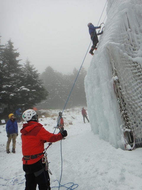 (進藤ま)12月に入り3度目の八ヶ岳は恐れていた高度障害の症状が全く出ずに快適でした♪念の為に酸素缶持っていきましたが使いませんでした。初日は裏同心ルンゼのF1、F2の右岸の氷瀑で登りました。快晴で八ヶ岳ブルーのなか年末とは思えないほどの暖かさで上着を脱いで薄着になりながら楽しくTRでアイスを楽しめました♪宮崎さんは初めてとは感じられないような登りでした。2日目は天気は良くありませんでしたが赤岳鉱泉のアイスキャンディで山宮会長も加わり練習できて良かったです。今回もガッツリとアイスを堪能した山行でした。