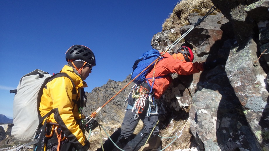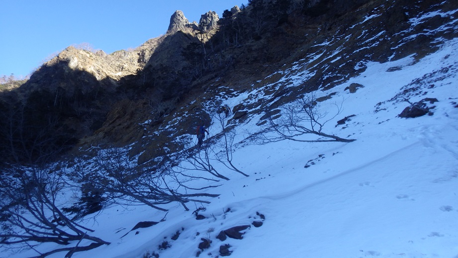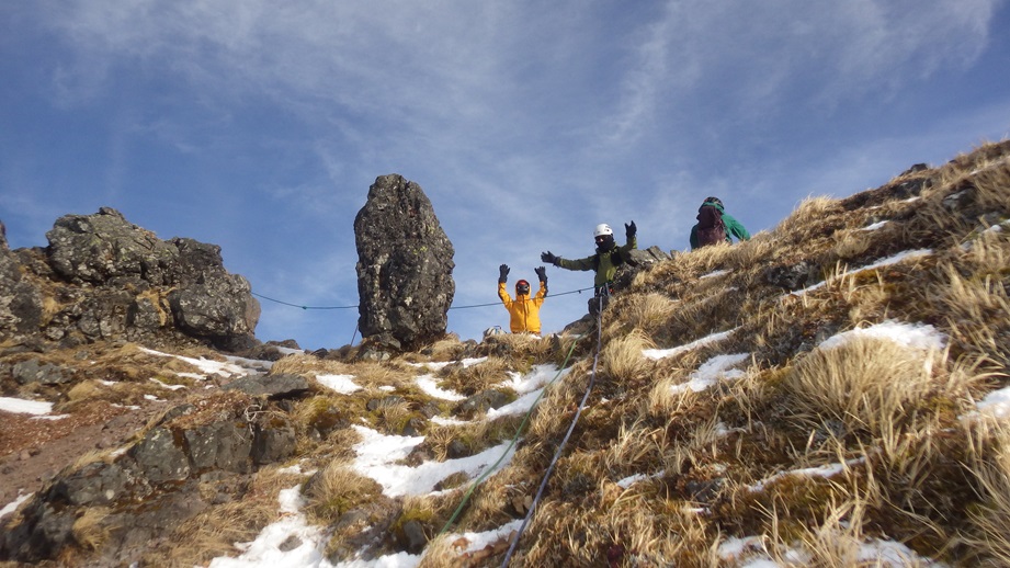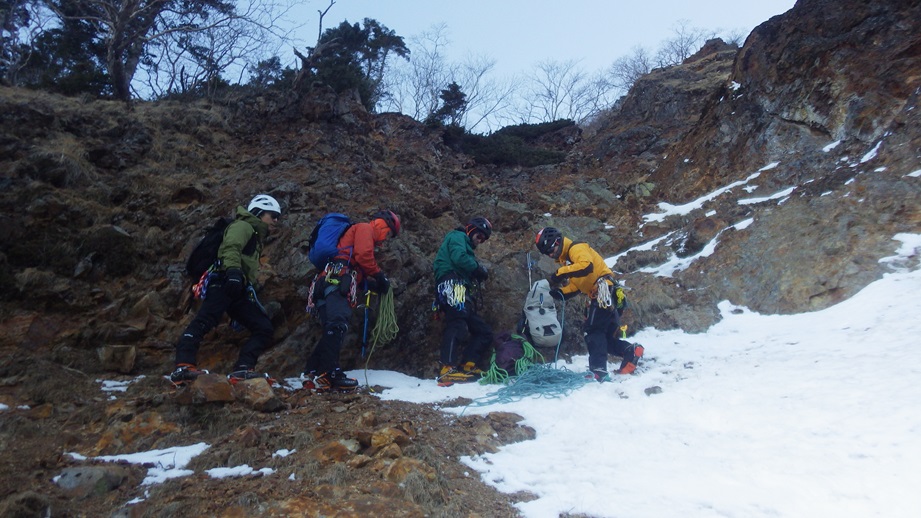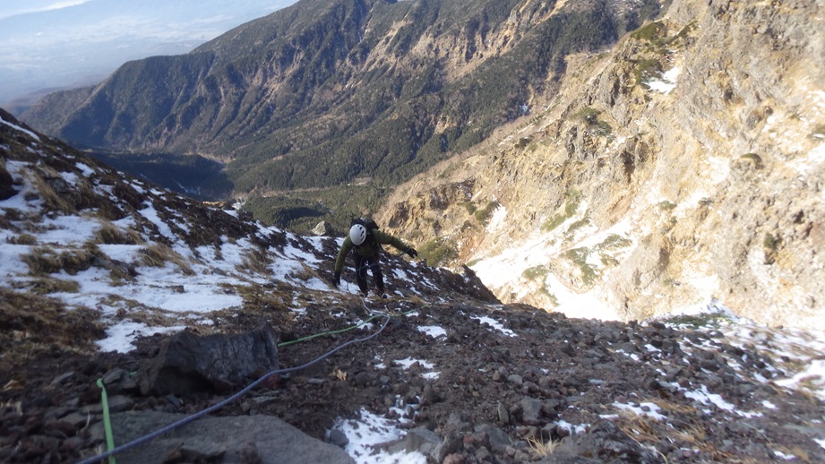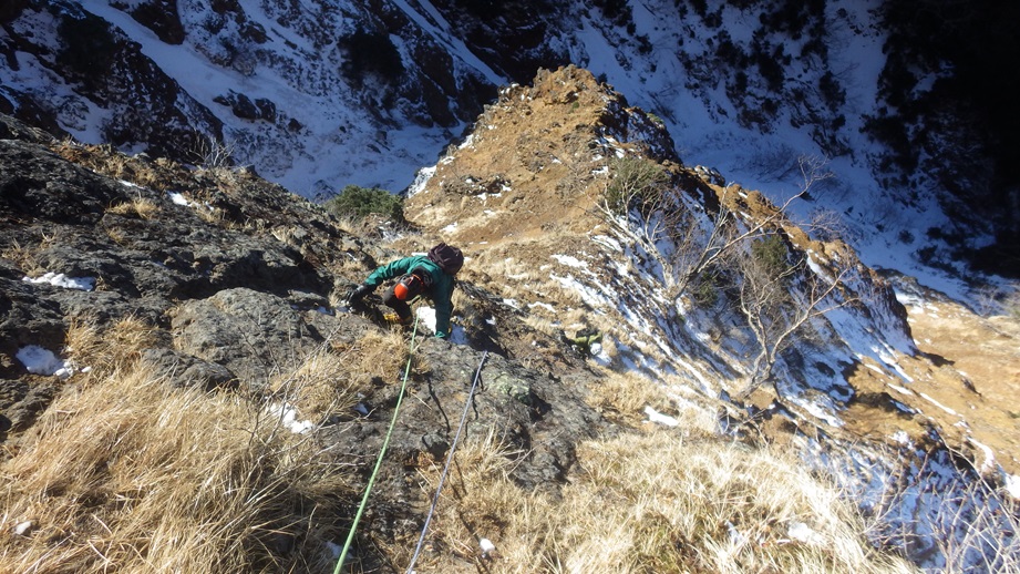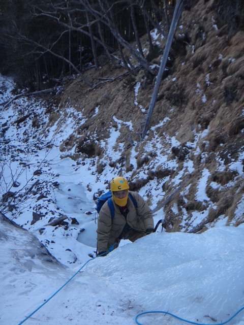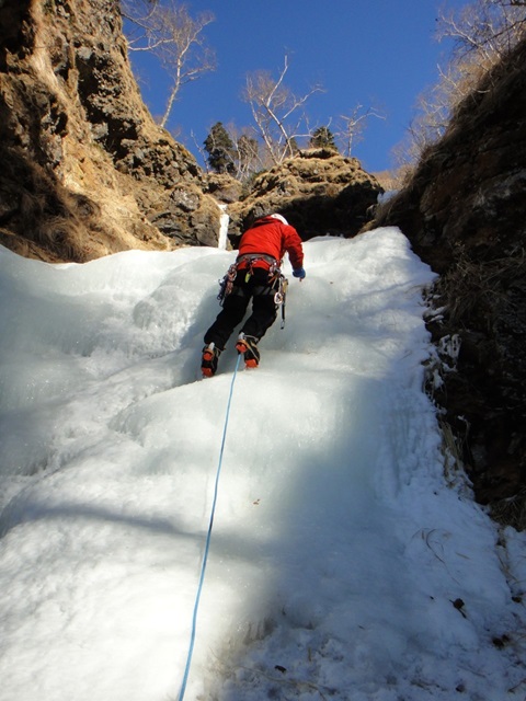 (荒木)初日は石尊稜を木村さんと組んで登りました。リードもさせてもらいましたがルーファイがまだまだでした。(登った後に下を見たら簡単に登れそうなところがあったり、終了点を見逃して中間支点と灌木で終了点を作ったりしてました。)視野を広くもって登れるよう訓練したいと思います。2日目は初めてのアイスで木村さん指導のもと裏同心ルンゼとジョウゴ沢で登りました。スクリューの打ち方も教えて頂きリードでも登りました。