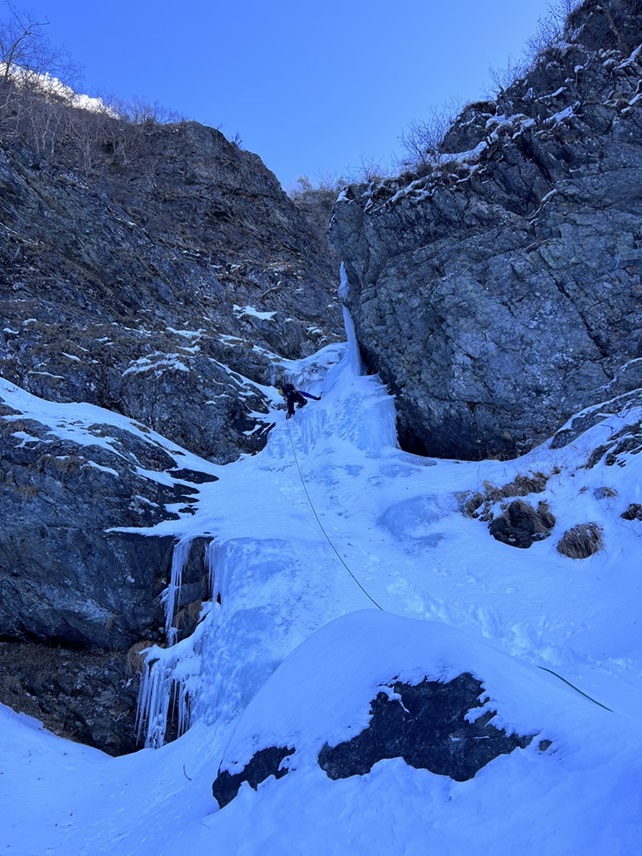 ▶F6:2段60m(フリー)1段目は雪面に左から巻いているトレースがありましたが山宮先行でコンテで登る。(フォローの木村さんは肩絡みビレイで確保した。)2段目も1段目と同じような氷瀑で登れない事もなかったのですが氷瀑左端の雪道にトレースがあり時間ももったいないので巻きで登って最後の岩に突き当たったところで右にある氷瀑に移って登りました。(終了点としてF7下の氷にアイススクリュー1本で支点構築してフォローのKさんをボディービレイで確保する。)