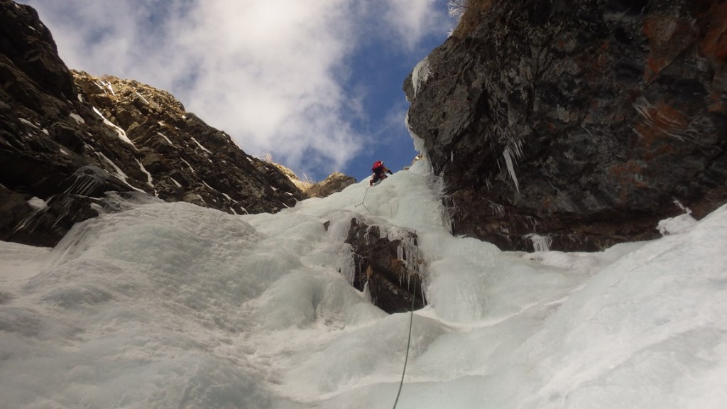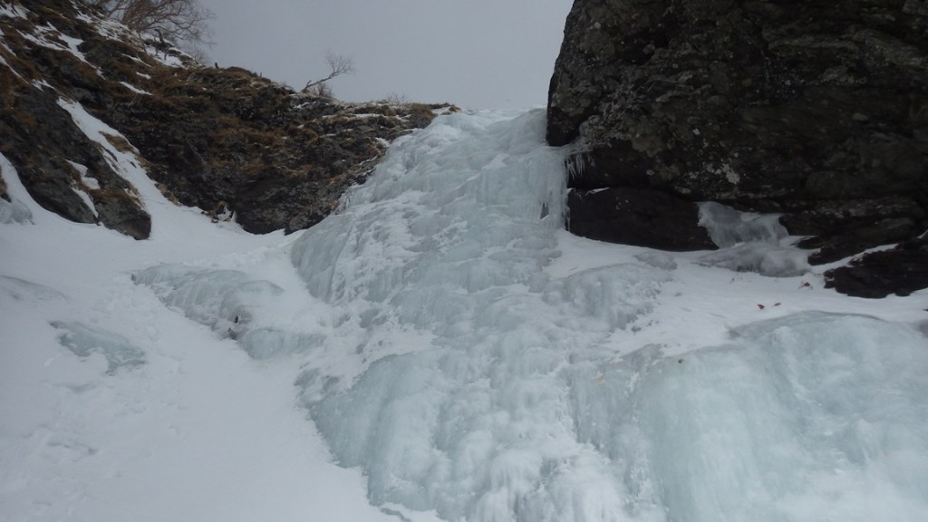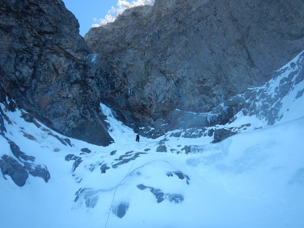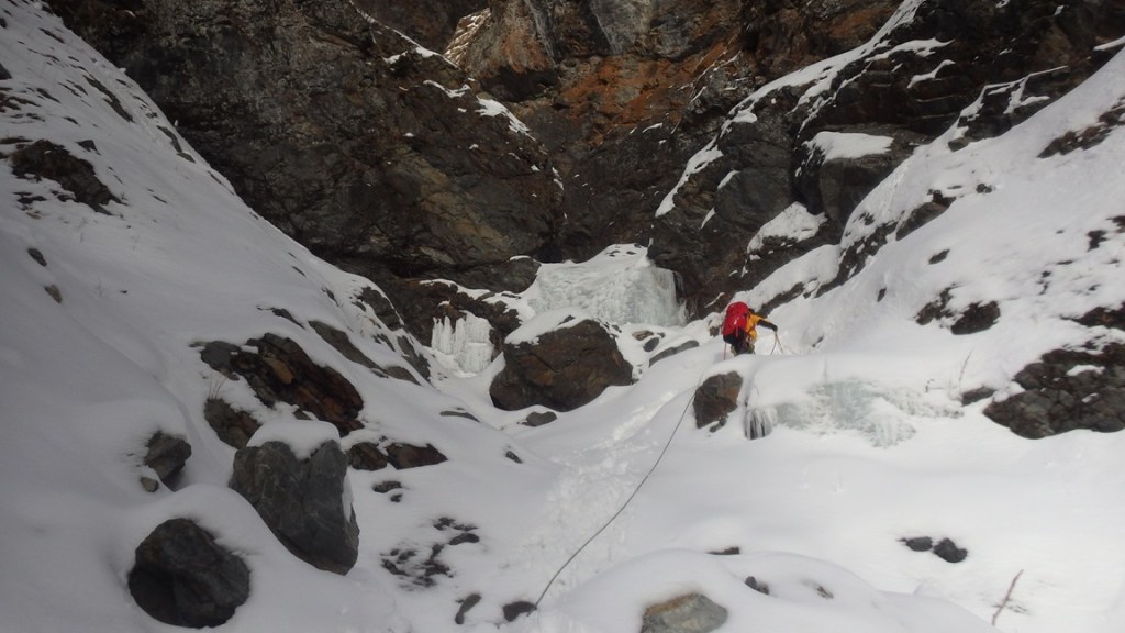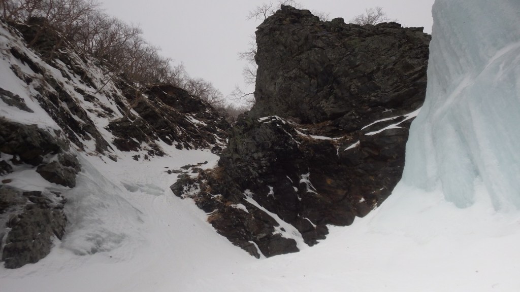 ▶F5:20m(フリー)左側の雪に埋まっていたナメ滝みたいのがF5らしいが山宮先行でコンテで登る。(右側には貧弱な氷があったがそこは登らず。)