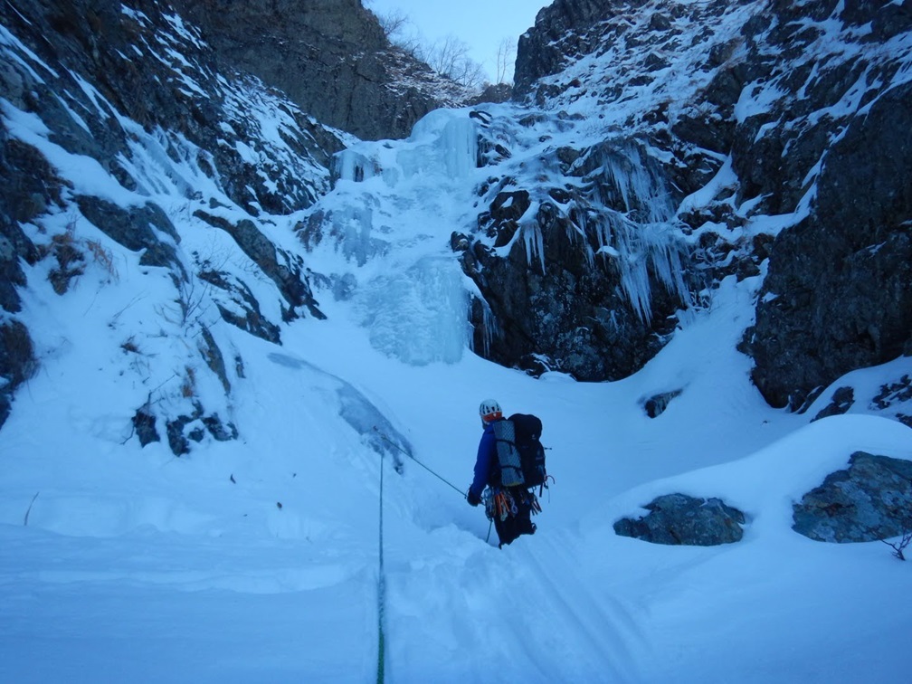 ▶おまけ2段氷瀑(フリー)1段目を登ると二俣になっていて左へのルンゼがあるがそこは詰めずに右の2段目の氷瀑を登る。終了点は適当な氷にアイススクリュー2本で構築。(フォローの木村さんはセカンドビレイで確保した。)登攀終了後ここでロープを片付ける。正面にまだ氷瀑が見えるが氷瀑下まで登ると二俣になっていて(ここがトポで言う奥の二俣かな。)ここから左のルンゼに入る。