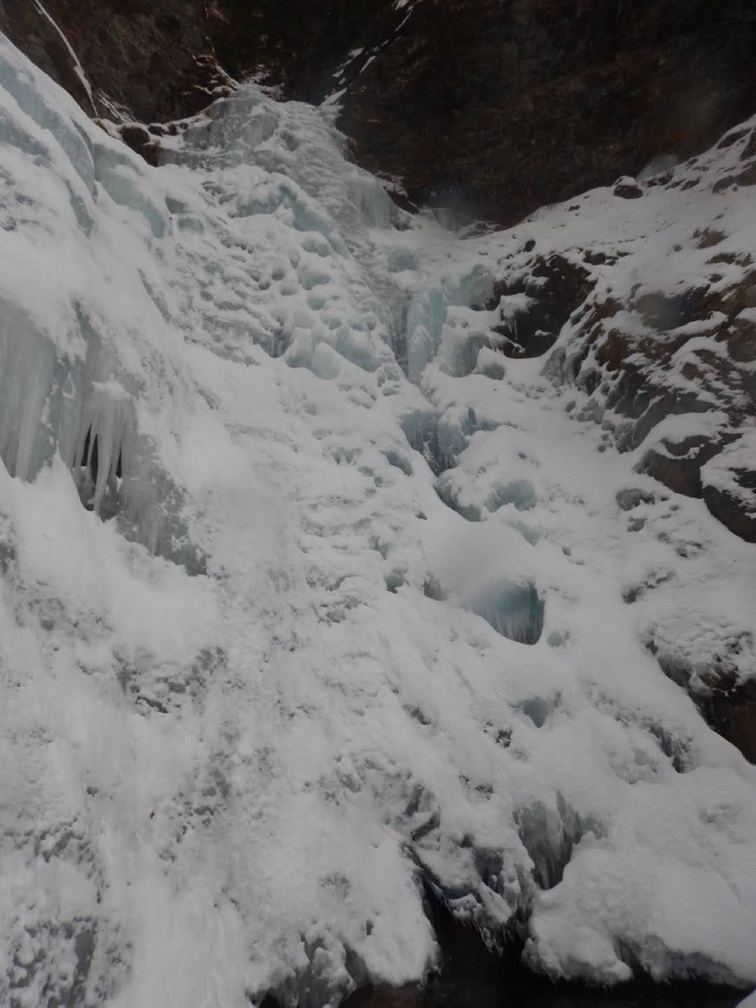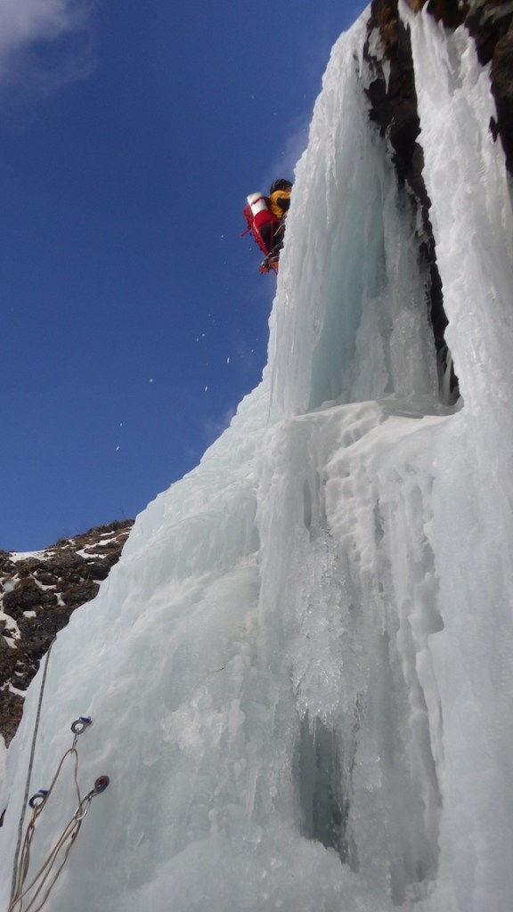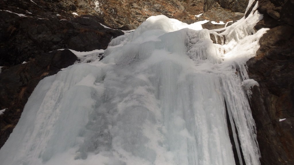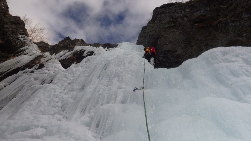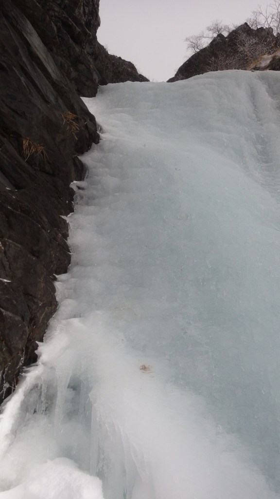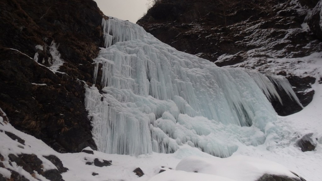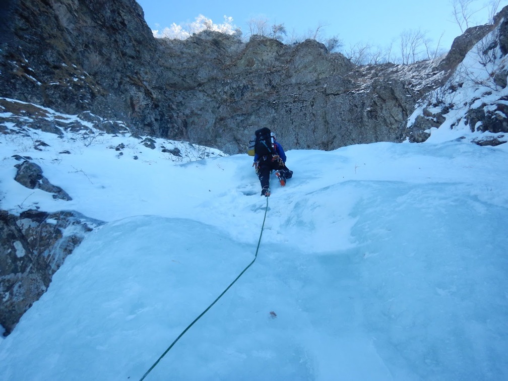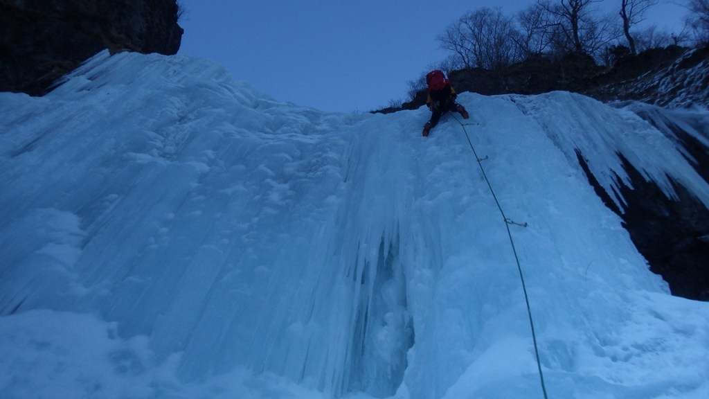 ▶F8(ソーメン流しの滝):110m(1P目、2P目とも木村リード)今回は1P目出だしが既にかなり上部でロープが70mあったので1Pで登れると思ったのですが2Pで登りました。1P目はスタート地点から少し右へ登って左へ登っていくと傾斜が緩い区間が終わりバーティカルな氷へ。バーティカル氷を半分の登ったところで氷にアイススクリュー3本で終了点を構築してピッチを切ってました。(普通F8を2P目で登る場合はバーティカルが始まる基部でピッチを切ると思いますが、今回木村さんはバーティカル氷を登っている時にロープ半分のコールが聞こえこの先は?上まで抜けれるのか?と思ったらしくバーティカル中間の半端なところでピッチを切ったそです。)フォローで登っていくとロープ引上げの際にロープトラブルになったらしく木村さんから『ここのロープをくぐってください』と言われましたが、ハンギングビレイ中でゴチャゴチャ面倒なので木村さんが構築した終了点の右(バーティカル氷の右端と岩の間のスタンスが安定したところ)の氷にアイススクリュー2本で新たに終了点を構築してロープを手繰ってロープトラブルを解消。2P目は木村さんは1P目終了点から左へトラバースして右上~直上する簡単なラインを選んでリード、フォローの私は1P目終了点から直上。しかし左へトラバースして登り始めるところにアイススクリューを1本打ってあったので直上から足元が微妙なところを左へトラバースする羽目に・・・(その後アックスを打ち込んで登ろうと荷重した瞬間ピック下の氷が割れて1回フォール。さっさと登ろうと焦りすぎでした。)2P目終了点は右岸の灌木にスリングで構築。ソーメン流しの滝は水っぽい氷でした。