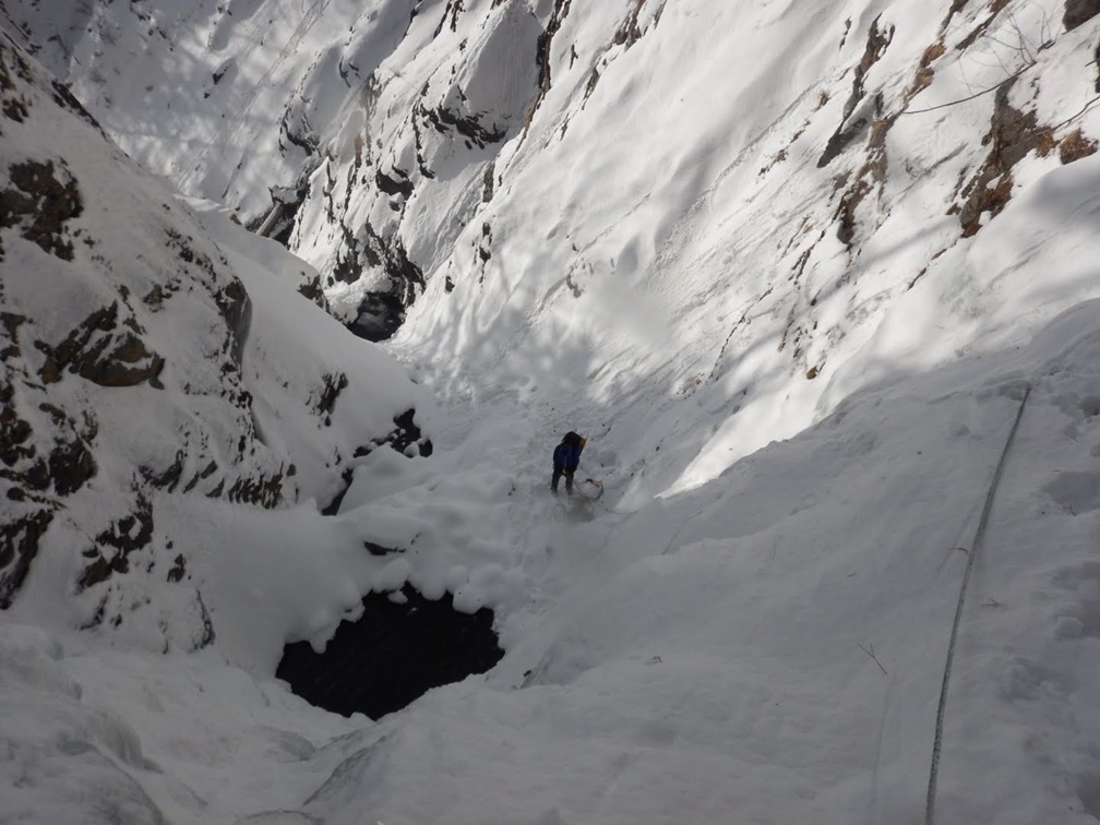 (山宮)初日は岳沢乗越で『できるだけ登らずに近道を!』と木村さんの提案に乗っかりましたが結局迷って時間ロス(笑)その後F1前衛の滝壺が凍ってなくて悪い右岸高巻きからの懸垂下降で時間ロス。結局初日F5下幕営予定がF2下幕営でした。