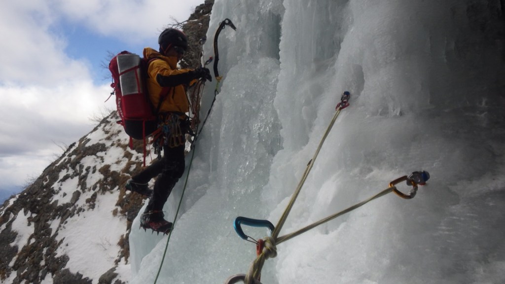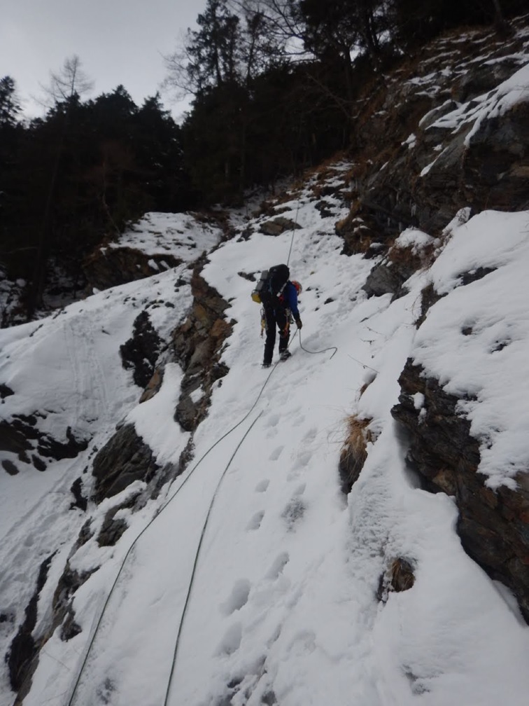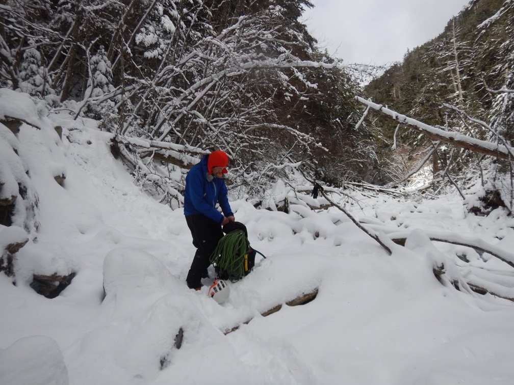 ・F1手前の前衛滝の滝壺が凍ってなくあれこれするも突破できなかったので高巻きを選択。右岸の巻きは登った後の下降が悪そうだったので灌木を利用して懸垂下降で下りました。