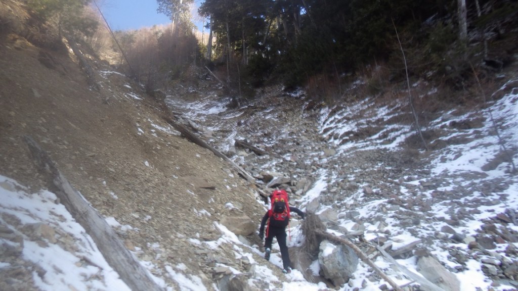 ・三峰川へ下りるとそれなりに雪があり前日入った先行者のトレースを辿って左岸と右岸を交互に歩いて岳沢出合まで行きました。