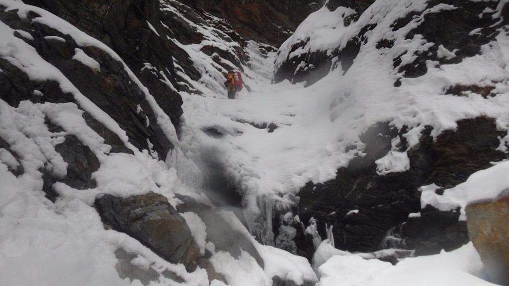 ▶F2:10m(木村リード)F2手前に滝がありそれを登ると左のルンゼ奥に氷瀑、右にF2がある。F2は真ん中の凹角の階段状を登る。終了点はF3滝下の岩角にスリングで構築。(幕営予定地はF5~F6の間の岩小屋にしていたが、ここで16:20だったので先には進まずここで幕営。)
