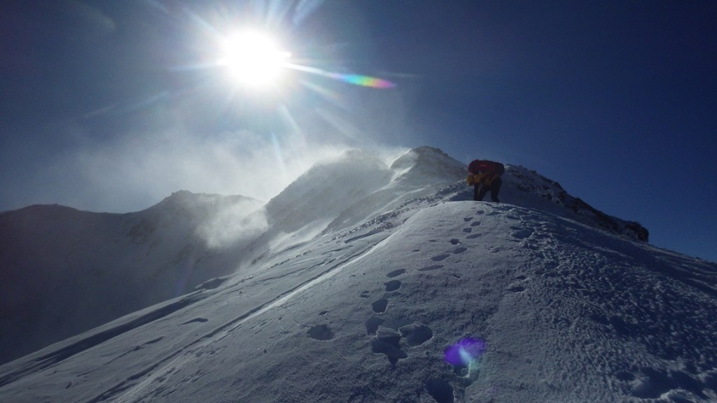 1/7 晴れ→お昼過ぎから雲が出てきて次第に稜線はガスっていった。日が暮れると風が強くなり小雪が舞う。視界は5m程度。