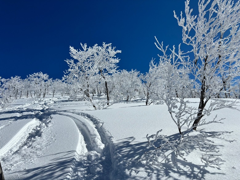 ★感想:いつものハイシーズンのようには行かないもののルートを選べば薮はさほど気にならず進めました。守門は大賑わいでラッセル要員には事欠かずピークまでラクさせてもらいました。滑りは出だし快適でしたが樹林帯に入ったあたりからは深く重い雪に。急斜ではまだ見え隠れする薮に足を取られないよう慎重に下り無事帰還。登山口に戻ると車は20台ほど停まっていました。今日のトレースはほぼ直登だったけど今回初めて使ったポモカの青は今まで使っていたコンツアーよりグリップ力が高くて良かった気がします。吸着力が凄くてノリが板に着かないか心配…。メンテには気を遣いそうです。