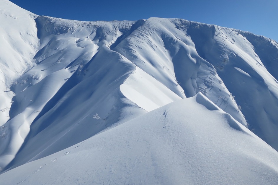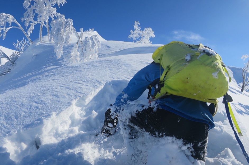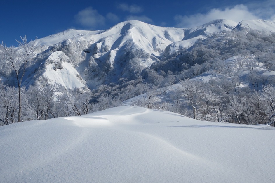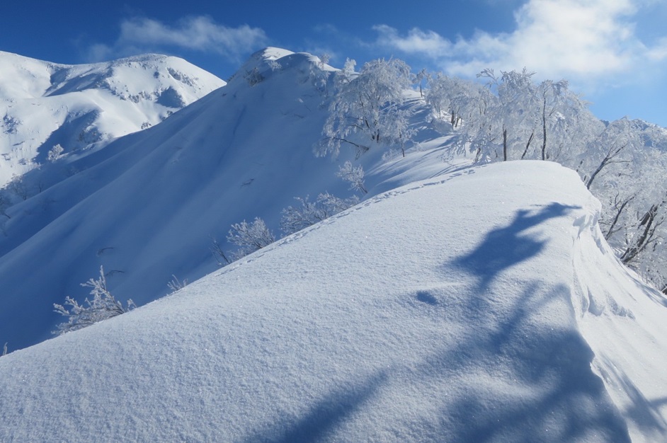 (土田貴)スタートから山頂までフルラッセルでした。深いところは腰まで。単独行なら8合目前後で撤退してたと思います。ローテーションで回してなんとか登頂できました。やはり1月の粟ヶ岳は手強いと再確認。反面、入山者が少ない時期なのでとびきりの景色が拝めて大満足の日でした。特にお目当てだったノントレースの午の背を歩けて幸せでした♩