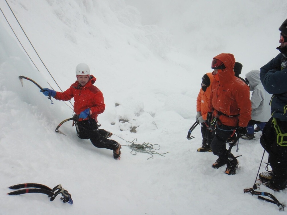 (廣澤)初のアイスクライミングでした。満さんにトップロープをはっていただきました。こんなに高い氷の柱を本当に人が登れるのかと思っていたところをどんどん登っていかれて驚きました。かっこよかったです!そして、アックスの持ち方や足の動かし方など、基本的なことを教えていただきました。ミニ氷柱は半分もいかないところでギブアップでしたが、とても楽しかったです。また、気温も低く風もある厳しい環境で長時間過ごしたのも初めてだったので、その点もいい経験をさせていただきました。雪洞もどきを掘ったのも楽しかったです。
