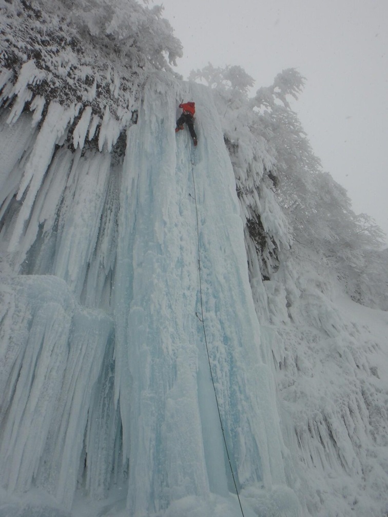 駐車するスキー場で、リフトを二つ乗り継いでから仙人沢に降りて行く。小雪の新潟がウソのように、膝を超える雪をラッセルしながら進む。深雪も下りだからまだしも、上りだったらラッセルも往生していたかも知れない。(帰りの登りはトレースを辿れたので思いの外ではなかった)30分余りでいくつかある氷瀑一つ、「ミニ氷柱」に着いた。ミニとは云うが、30m近い直立した氷柱は威圧感たっぷりだった。気温マイナス15度、風力4前後、粉雪舞う曇り空。初めての「アイス」が何人かいた中でのコンディションとしては最低に近いとは、まり子さんの弁。みんなが寒い寒いと声をそろえていたが、「帰ろう」と言い出す人は誰一人いなかった(笑)ハーネスなどの準備を整えて、みつるさんがリード壁を務めた。「氷が硬すぎ…」と云いながらも、難なくトップロープを掛けて降りてきた。更に、隣りの短い氷柱にも「練習の練習用」のトップロープ作ってくれてたので、参加者一同それぞれを使い分けながら氷瀑に取り付いていった。この仙人沢アイスガーデンは、氷瀑のアイスクライミングを見ながらの雪上ツアーのルートにもなっていて、悪天の中三組ほどが私たちを見学していた。天候が一向に回復しないので、練習時間の切り上げもありそうな気配の中、次第にみんなの調子が上向いてきて、飽きるほどアックスを打ち込んでいた。登攀状況については詳細を省くが(^-^)、ワタシのへっぴり腰以外は満足のいく成果だったようです。気が付けば撤収時間は15時を廻っていた。終点リフトまでの上りはトレースを歩いたのでラッセル不要だったが、帰りはリフトに乗らないで斜面を歩いたので、風雪を顔面に浴びながら急ぎ足の下山であった。駐車場からの帰路は日没後の17時、予定していた温泉を省略したので、解散場所の道の駅豊栄には21時前に着くことができた。