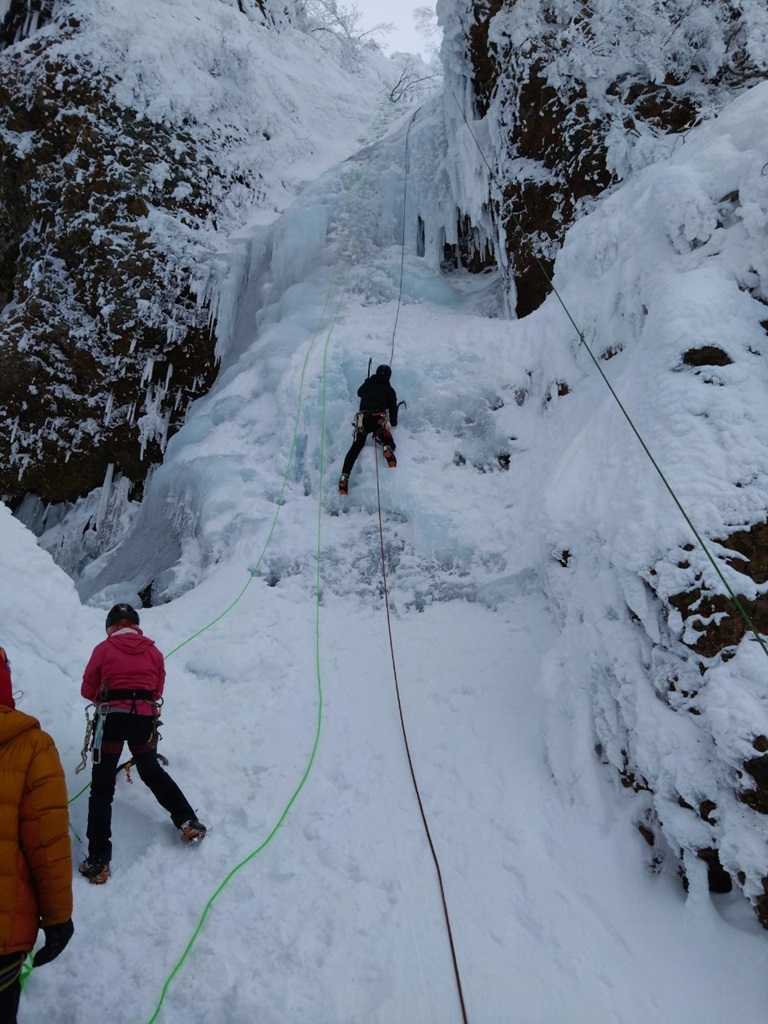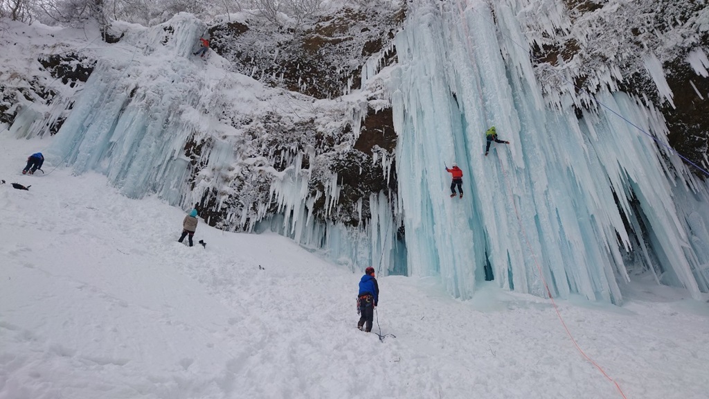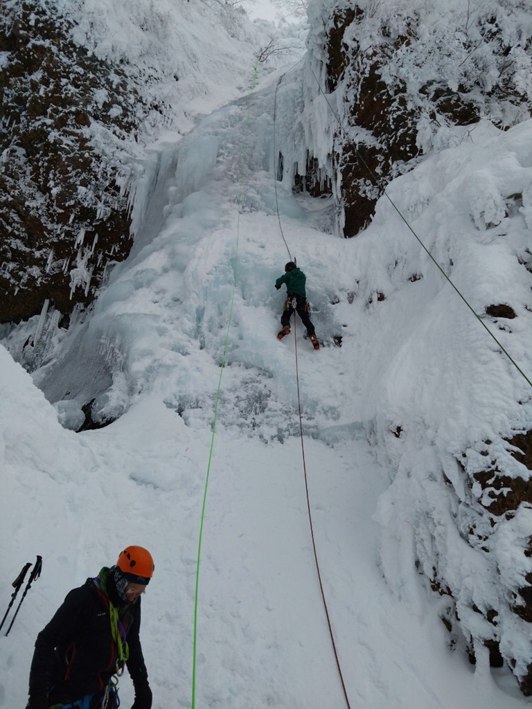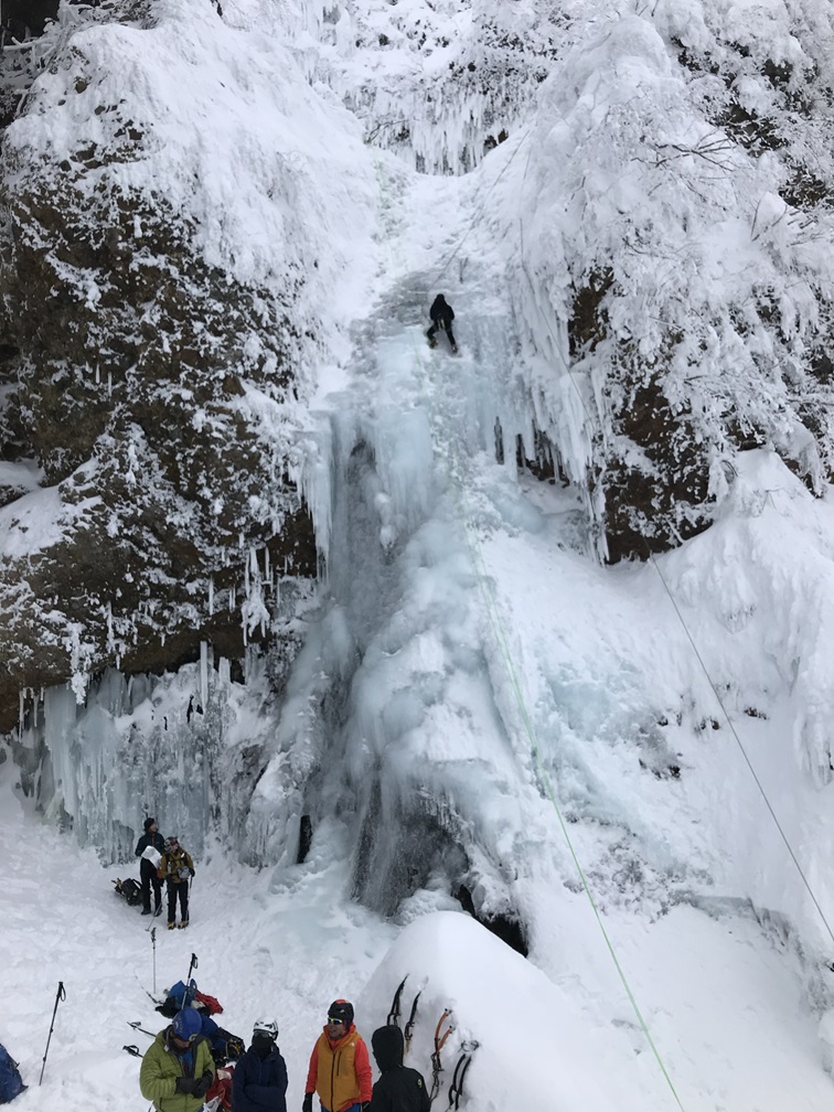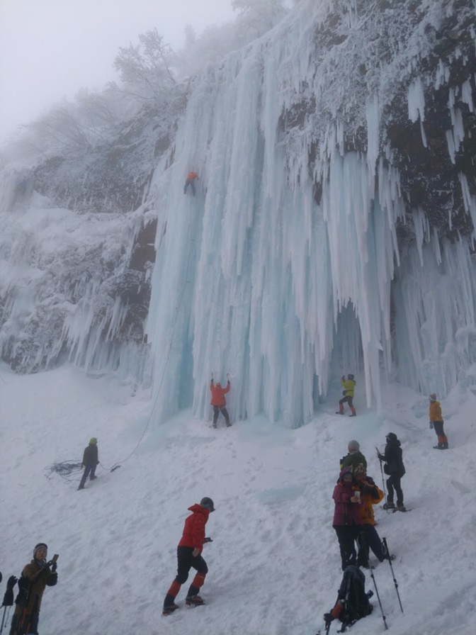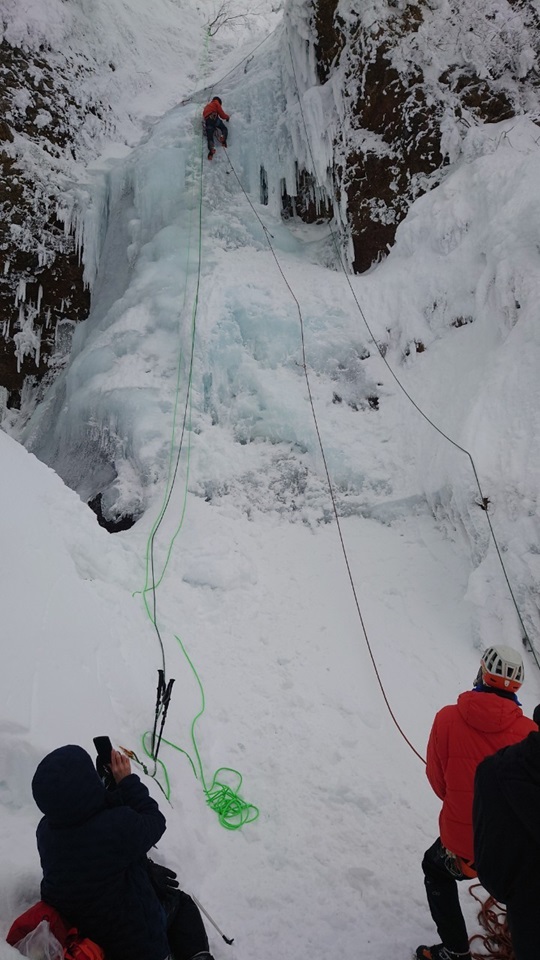(土田忍)先週とは打って変わって、クライマーや、氷瀑鑑賞のハイカーの方達で激混みの仙人沢でした。ようやく空いた糸滝を登ると山宮会長から「アイスの登り方が全然出来ていない!」とのことで、風間さんと二人、緩やかな糸滝を何度も登りみっちり指導して頂きましたが、自分にとっての理想的な登りをする1番のヒントは”ぶら下がる”ということでした。鉄棒に足を浮かせて両手でぶら下がるのと同じような感じに、アックスにぶら〜んと片手でぶら下がる感覚を掴むといくらかまともに登れるようになった手応えがありました。…がしかし、後日まり子さんが撮ってくれていた動画を見ると、自分が思っていた以上にヨレヨレクライミングな感じだったのでもう少しカッコ良く登れるよう頑張りたいと思います。山宮会長はじめご同行の皆様ありがとうございました。