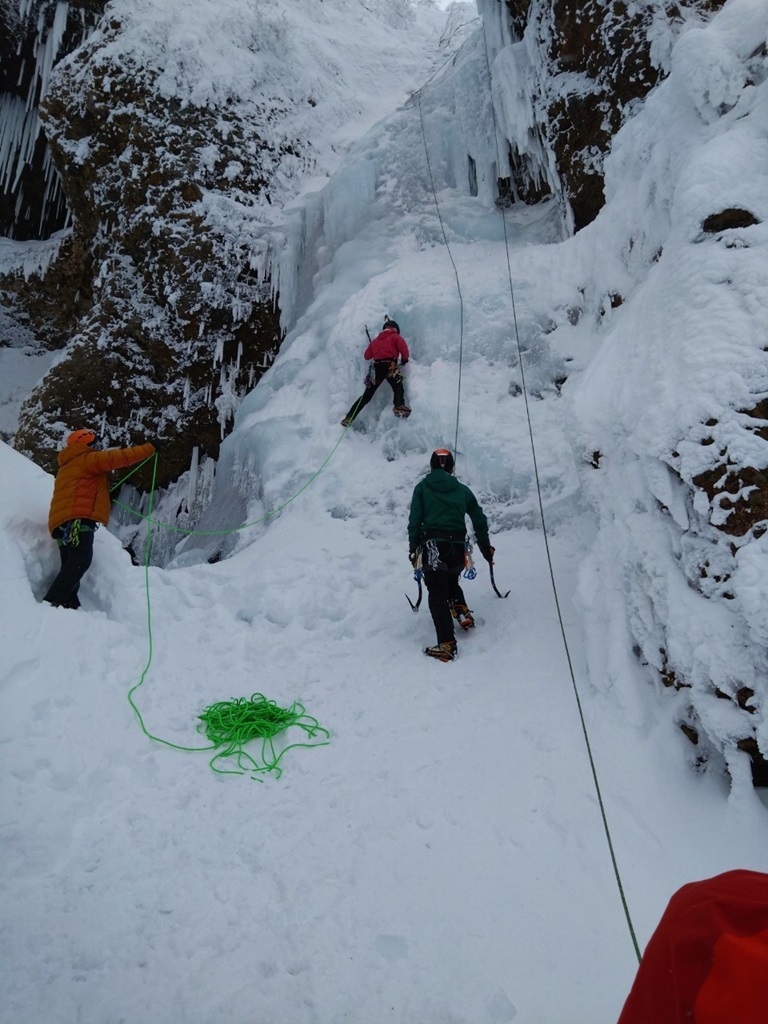 (風間)アイスクライミング初挑戦となりました。腕を疲れさせない登りかた、アックスのキマった感覚などを教えていただきました!基本の動きを忘れないようにして次に繋げられればと思います!終盤に疑似リードもさせていただき、アイススクリューの打ち方や打つ場所なども学ぶ事ができ、とても充実した1日となりました。ただ、一般登山客と口論になっていたパーティーがあり、少し残念な気持ちになりました。アイスクライミング禁止にならない事を願うばかりです。