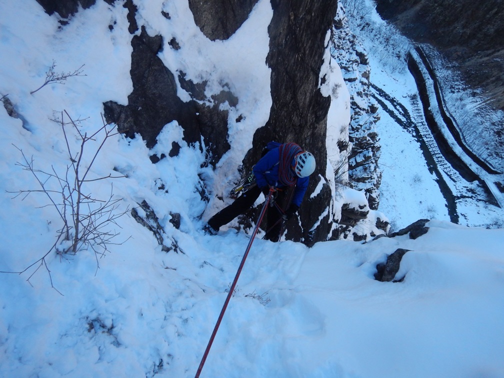 ・グローブメインで登攀しましたがポイントポイントでアックスでフッキングしながら登りました。(序盤の薄被り乗越しと中盤の強傾斜はグローブのみの登攀では難儀するかも。)