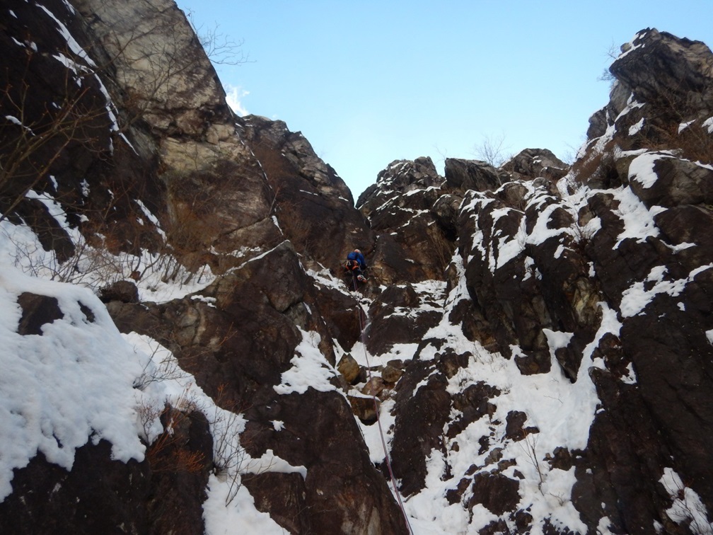 (木村)初のミックスクライミングのお誘い、有り難く行かせて頂きました。事前にWebで調べると最高グレードⅤ+(4P目)と有り。素手、フラットソールでは問題ないが、アイゼン、アックス、手袋で行けるのか…。前週の南岸低気圧のせいかルートには所々雪が付いていてお掃除しながらフッキングの場所を探る様なコンディション。アルパインクライミングはツルベで登らなきゃ!と自分に言い聞かせ、核心ピッチを避けて奇数を選択。山宮さんは、前回、偶数をやっているので、今回は奇数をリードしたかったのか…。苦笑いで「どうぞ」のお言葉。それでも3PのⅣ+のコーナークラックでは、