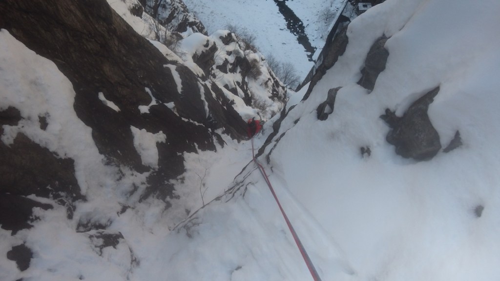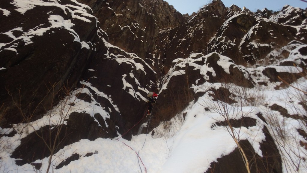 素手のカチが手袋では悪いスローパーにしか感じられず、思わず手袋を脱いで突破しました。4P核心部のクラックはアックスのフッキングで楽しく登れました。(フォローなので)この後、2ピッチほど登れるのだが、登攀要素があまりないので同ルート下降で無事登攀終了となりました。全体を通し、雪の状況によって難しさが大きく変わる