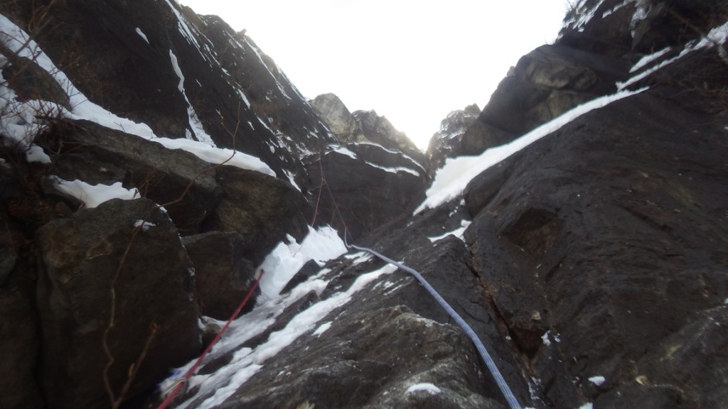 ・雪の付いたルンゼを除雪しながら登り垂壁から凹角状を除雪しながら登る。