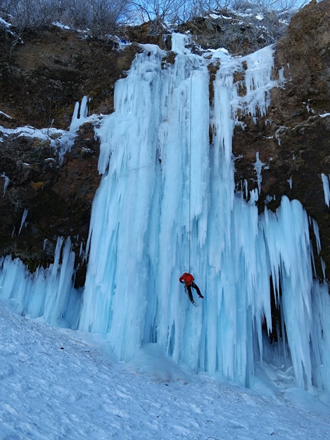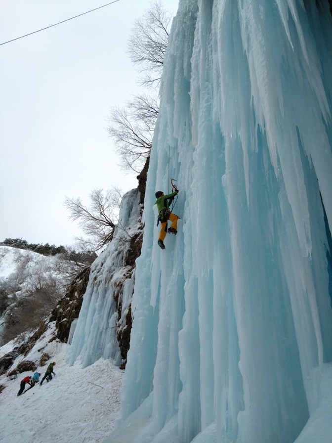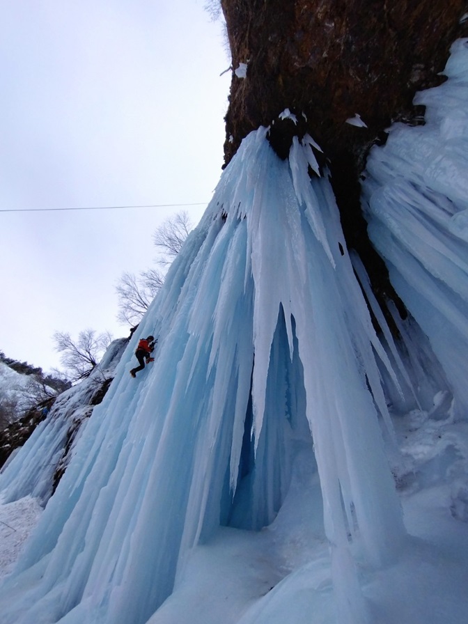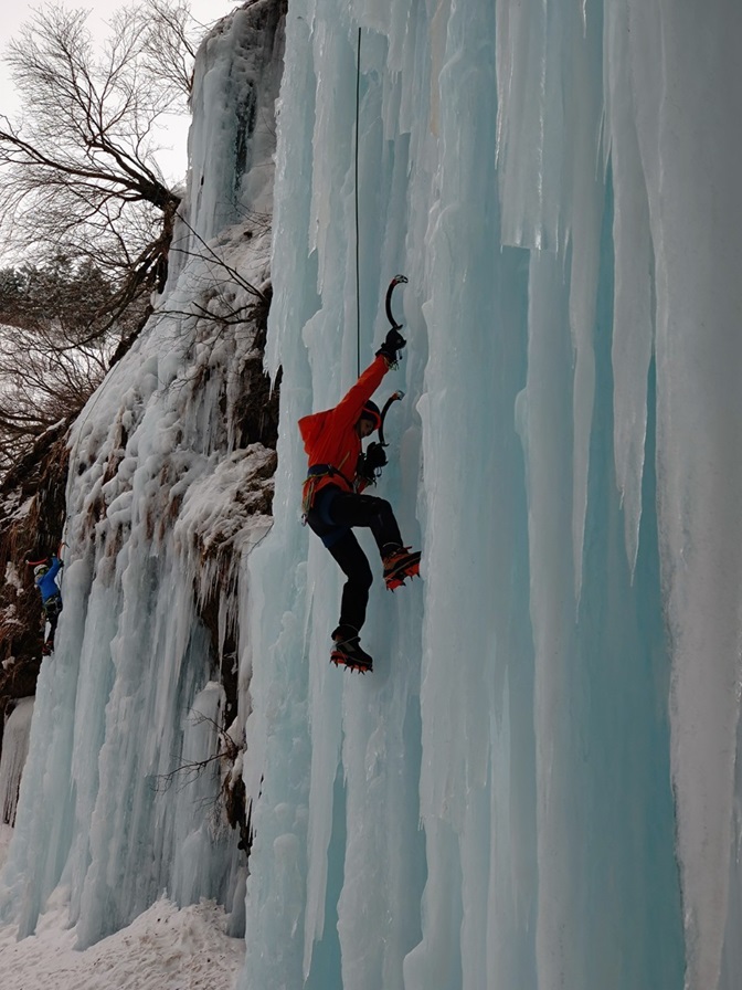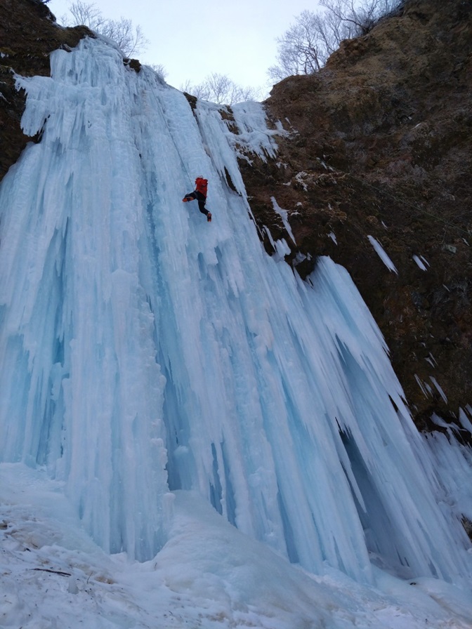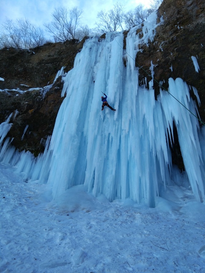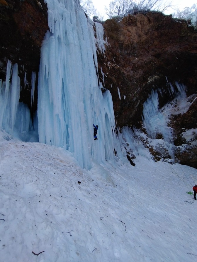 (進藤ま)暖かい日が続いたので氷の状態は悪く、大氷柱やミニ氷柱共に落ち口下の氷が薄すぎか、もしくはほぼ無い状態でだったので大氷柱は山宮会長と満さんで安全に脇から登ってTRを張りました。 でも今回の氷は硬すぎずちょうど良く刺さり楽しく登れました♪ 今回は大氷柱の真ん中のルートで登りましたが途中にハング超えがありなかなか登りごたえがあるTRなら楽しめ登れるルートでした♪ 今シーズンが仙人沢大氷柱をリードトライが目標でしたが… もうリードは難しそうです。来シーズンの目標になりそうです。