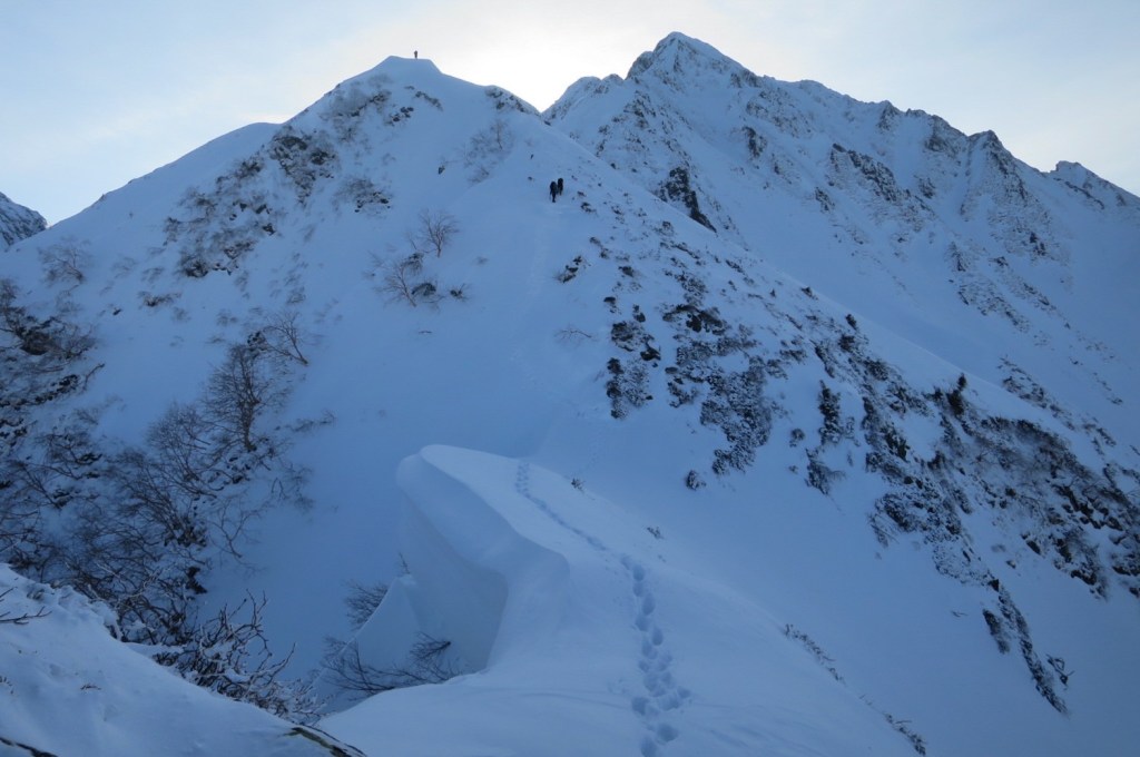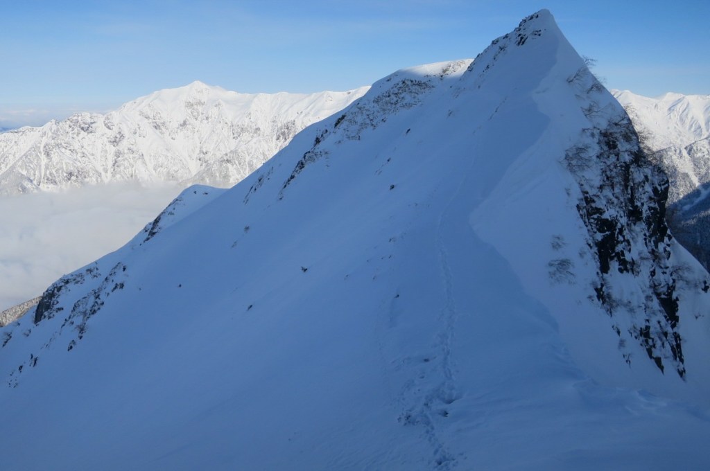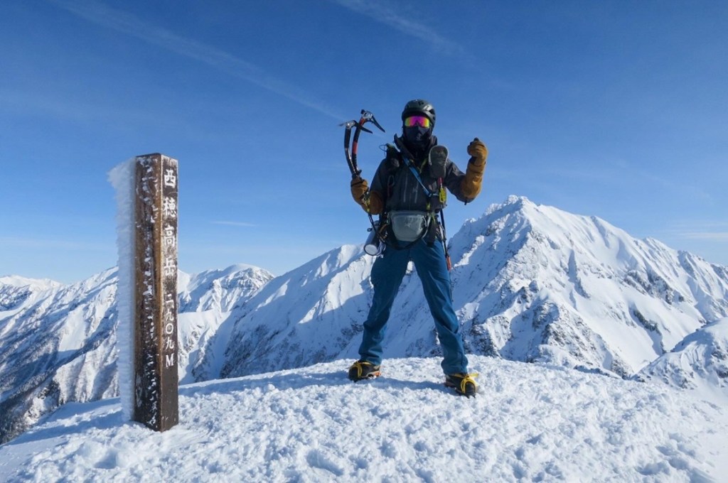 ★感想:今季目標の一つとしてた西穂高西尾根登頂できて嬉しかったです。昨年11月の会山行のアイトレ、年始で行った初外岩での吉川さんからの岩登りのご指導、仙人沢でのバーチカルアイス体験、全て活きました。第一岩峰から山頂までは気の抜けない難所が続きましたがお陰様で落ち着いて行動できました。また、本コースのハイライトは山頂直下の強傾斜のルンゼでした。ルーファイしつつダブルアックスを効かせ登り詰めていく様はアルパイン要素が強かったです。雪山アルパインクライミングに向けてこれからも少しずつステップアップしていきたいと思えた山行になりました。最後にルートアドバイスして下さった山宮さんありがとうございました。