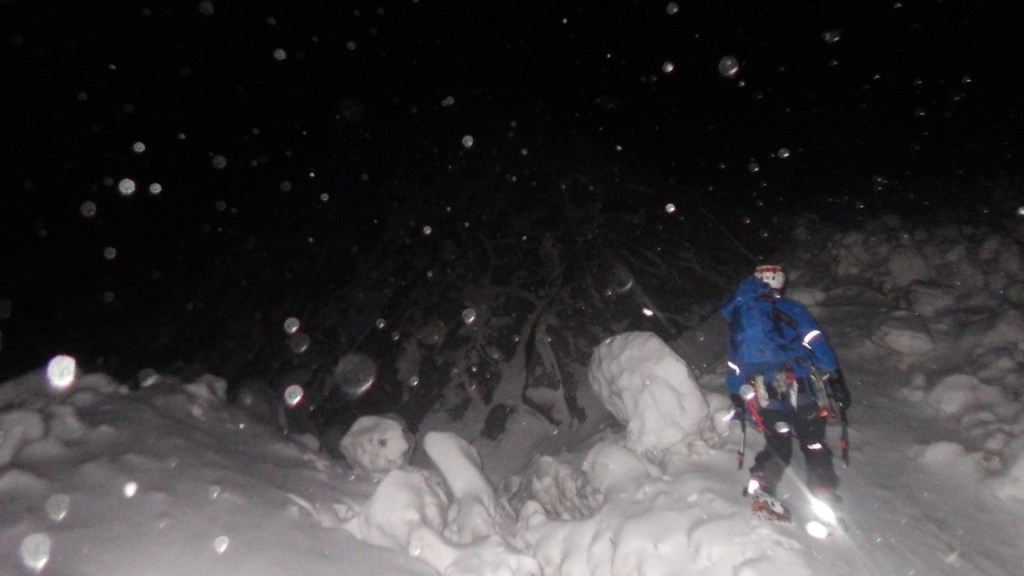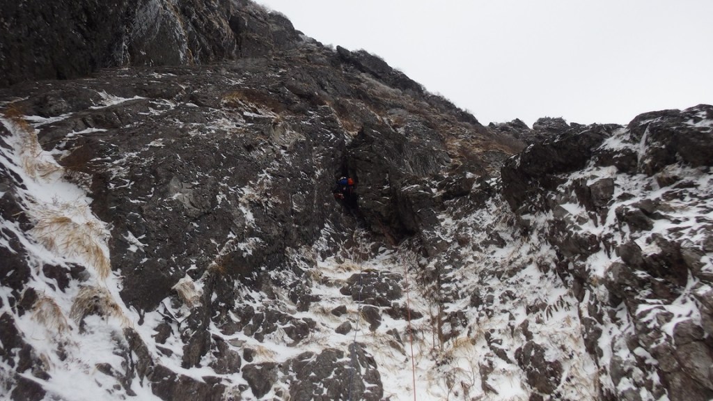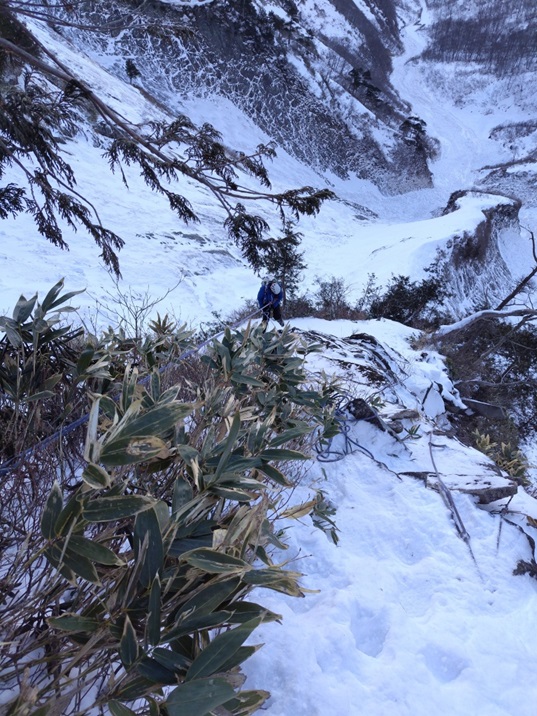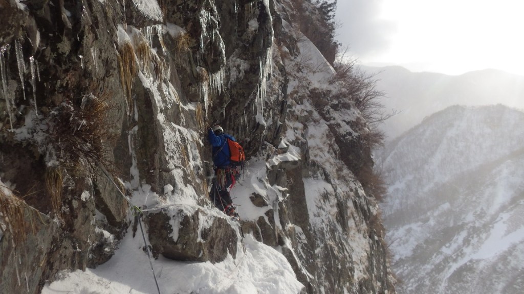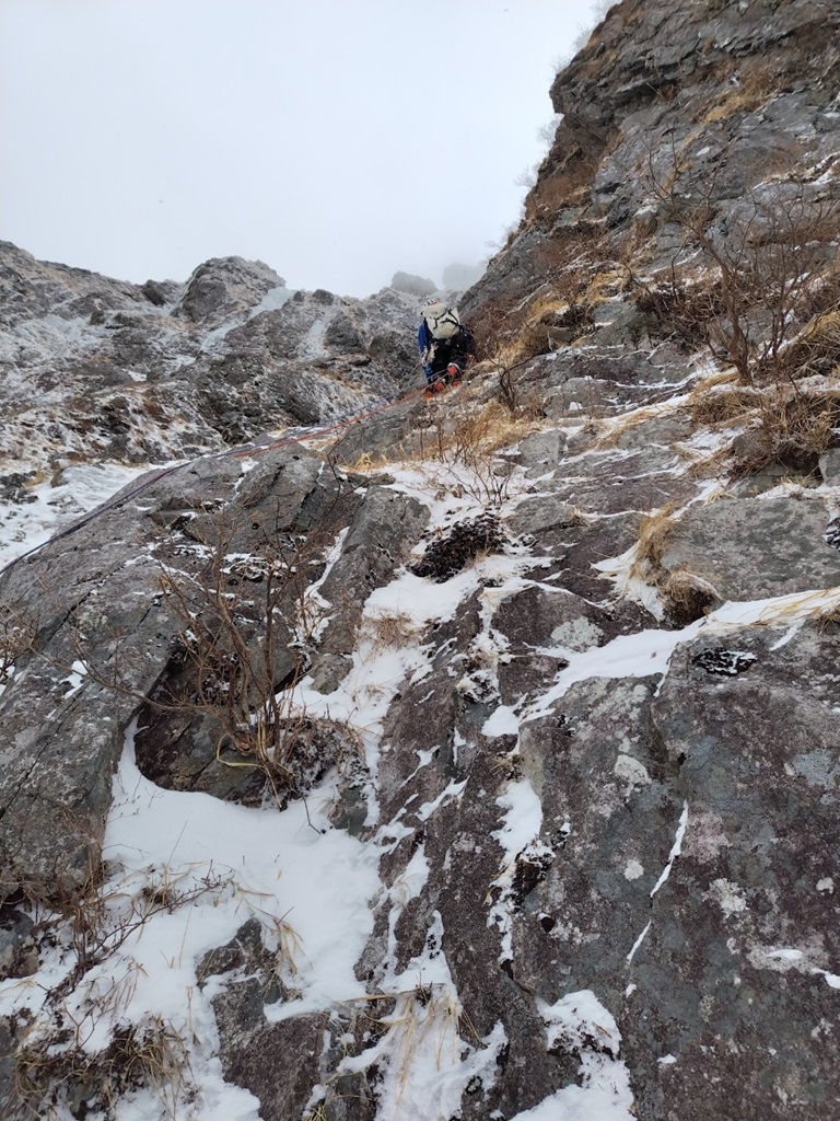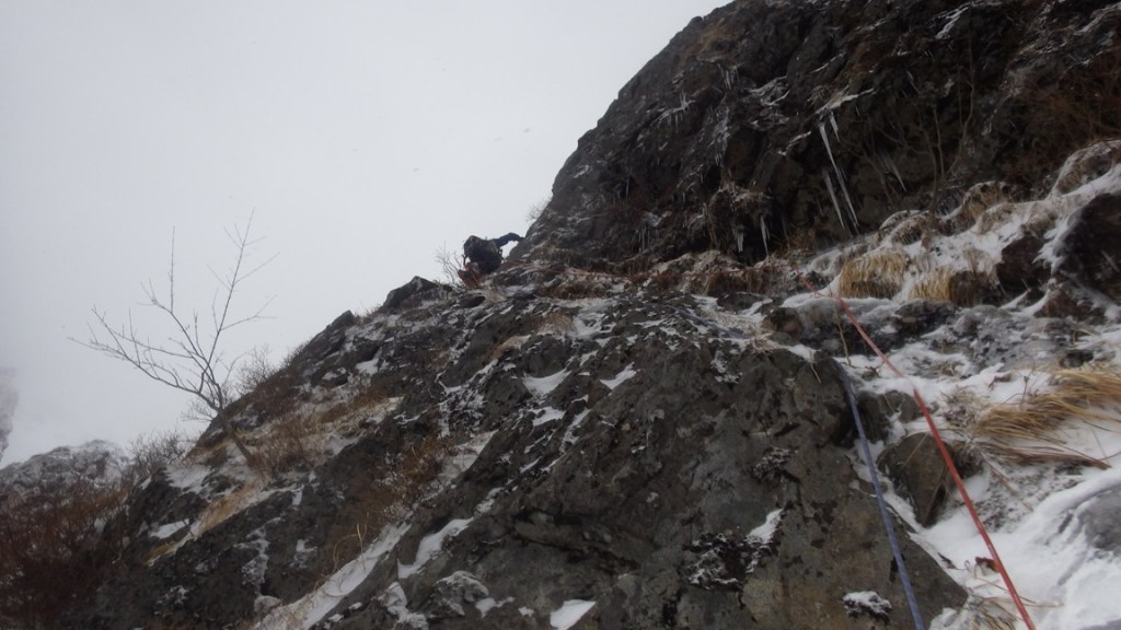 ・雪の乗ったバンド状は残置が少なく支点も取りづらくリードのWさんは苦労してました。フォローで登ってみてもやはり悪かったです。フッキングするところもなくグローブ登攀(おかげで手が冷たくなり痛くなりました。)になり、1~2箇所A0で登りました。
