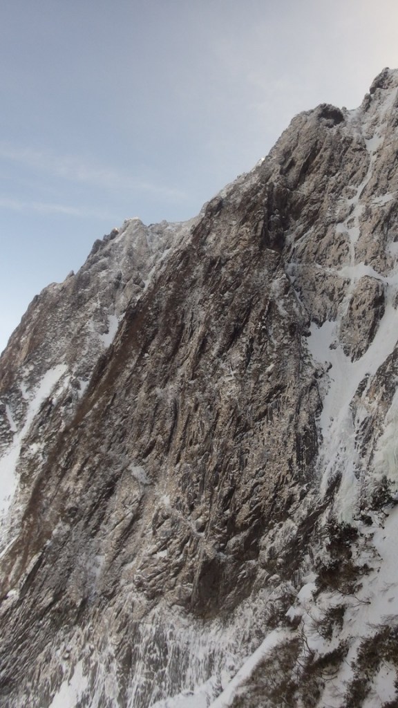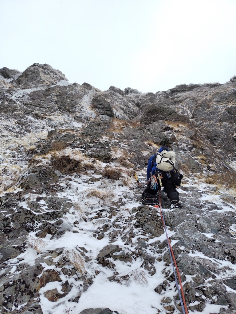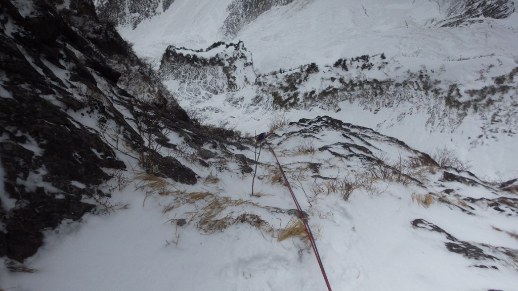 ・バンドを登りカンテを左から回り込むとカンテは傾斜がきつく残置無し灌木ほぼ無しなのにスタンスは外傾・・・細かいカチをグローブで持ったり微妙に凍った草付にアックスをフッキングしながら登りました。