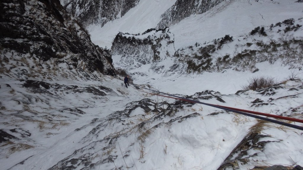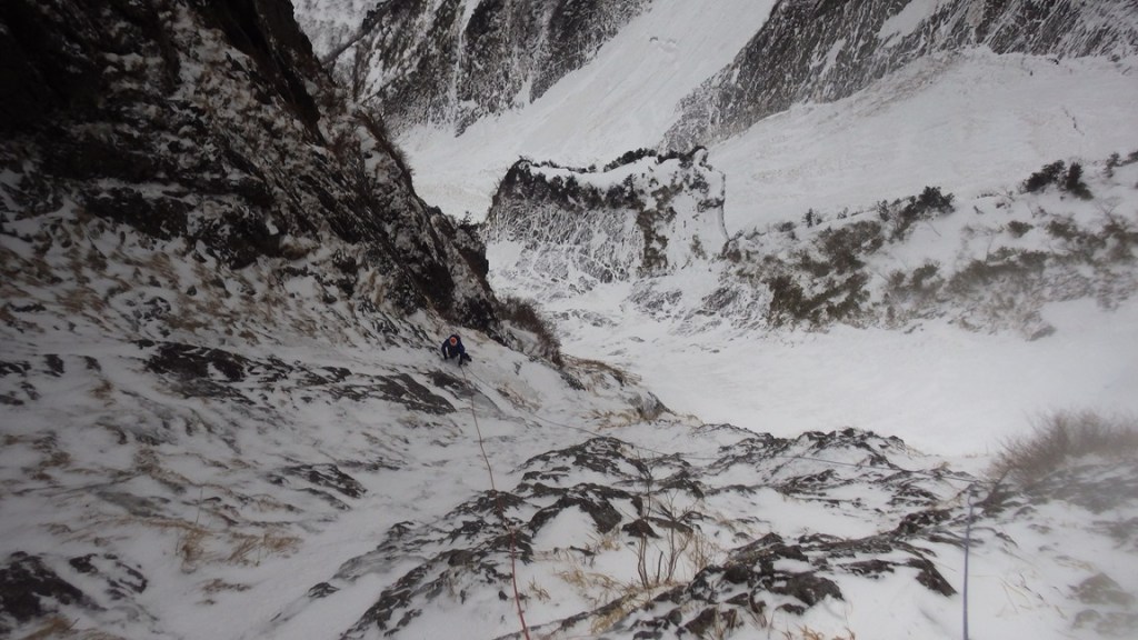 ・草付にアックスを決め(テイスティングはしましたが、確実に決まっているかどうか分からない・・・。)アックスに全荷重で外傾しているスタンスに立ちこんでいくムーブは痺れたというかあまりやりたくないです(笑)